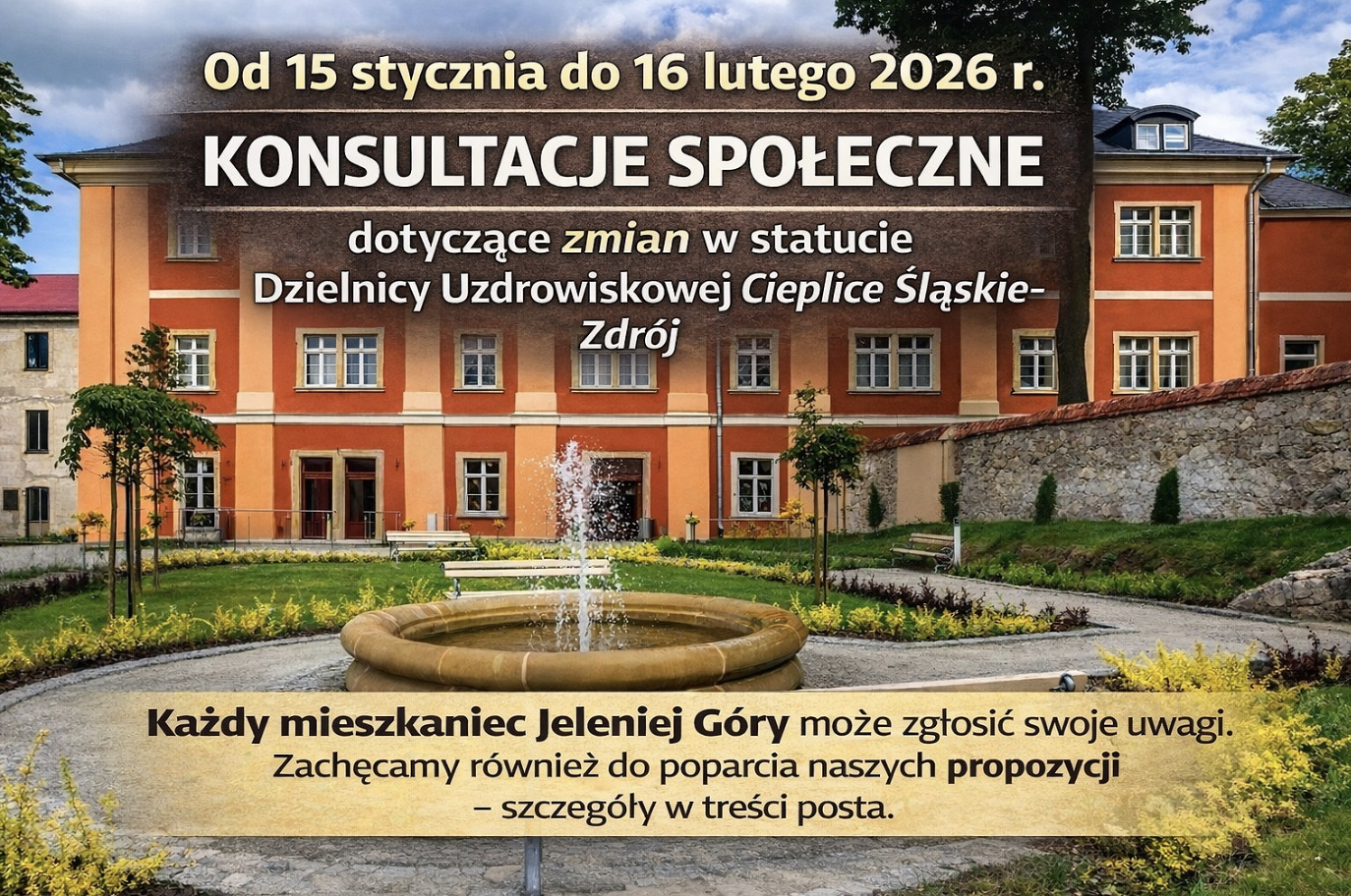Od 15 stycznia do 16 lutego 2026 r. trwają konsultacje społeczne dotyczące zmian statutu Dzielnicy Uzdrowiskowej Cieplice Śląskie-Zdrój. To moment, w którym mieszkańcy mogą faktycznie wpłynąć na to, jak Cieplice będą funkcjonować w kolejnych latach.