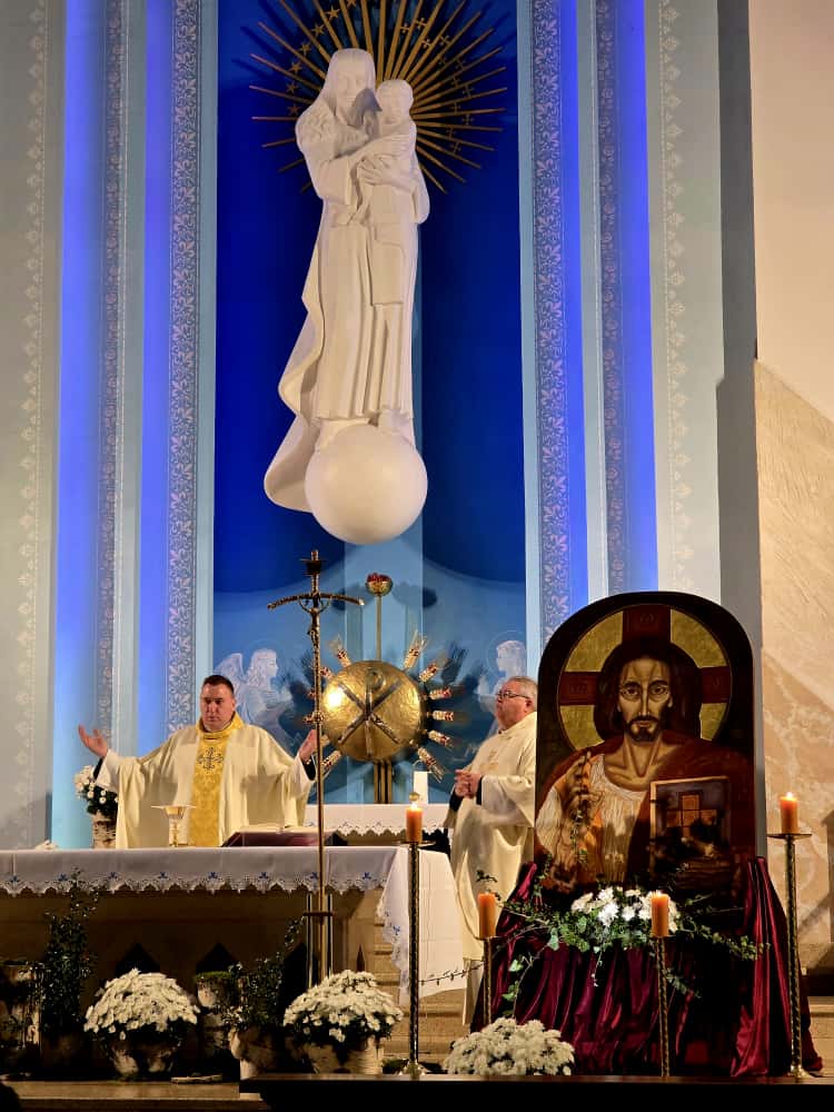 W niedzielę 9 listopada nasza parafia miała okazję gościć Grupę 2 Pieszej Pielgrzymki Legnickiej, która przeprowadziła czuwanie modlitewne na podstawie Apokalipsy św. Jana. Modliliśmy się przed ikoną Chrystusa Pantokratora sprowadzoną do parafii na czas nowenny przed odpustem parafialnym. To właśnie ta ikona towarzyszyła Pieszej Pielgrzymce Legnickiej w wędrówce do Częstochowy, na niej wypisywano intencje, a następnie został namalowany wizerunek Chrystusa.