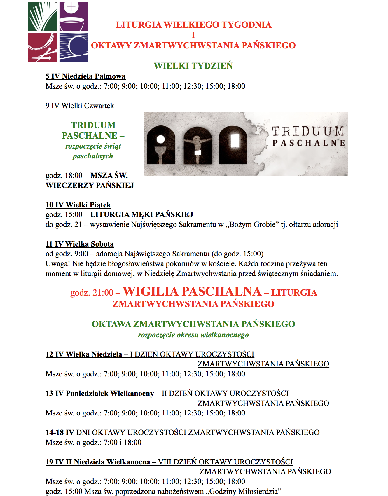 => Msze św. w Niedzielę Zmartwychwstania o godz.: 7:00; 9:00; 10:00; 11:00; 12:30; 15:00; 18:00.