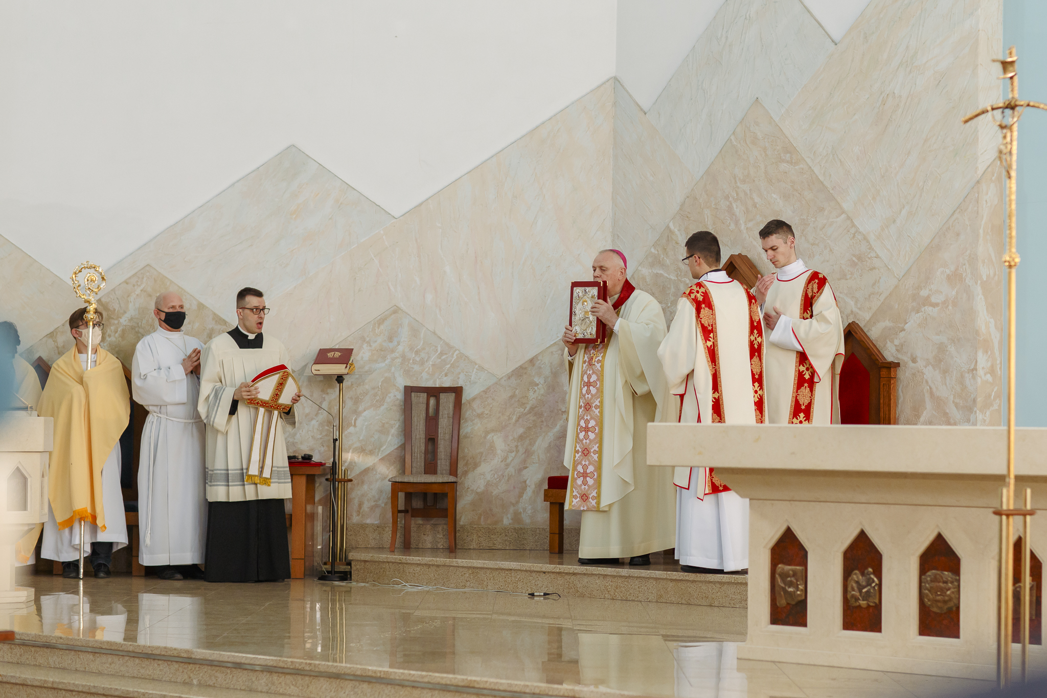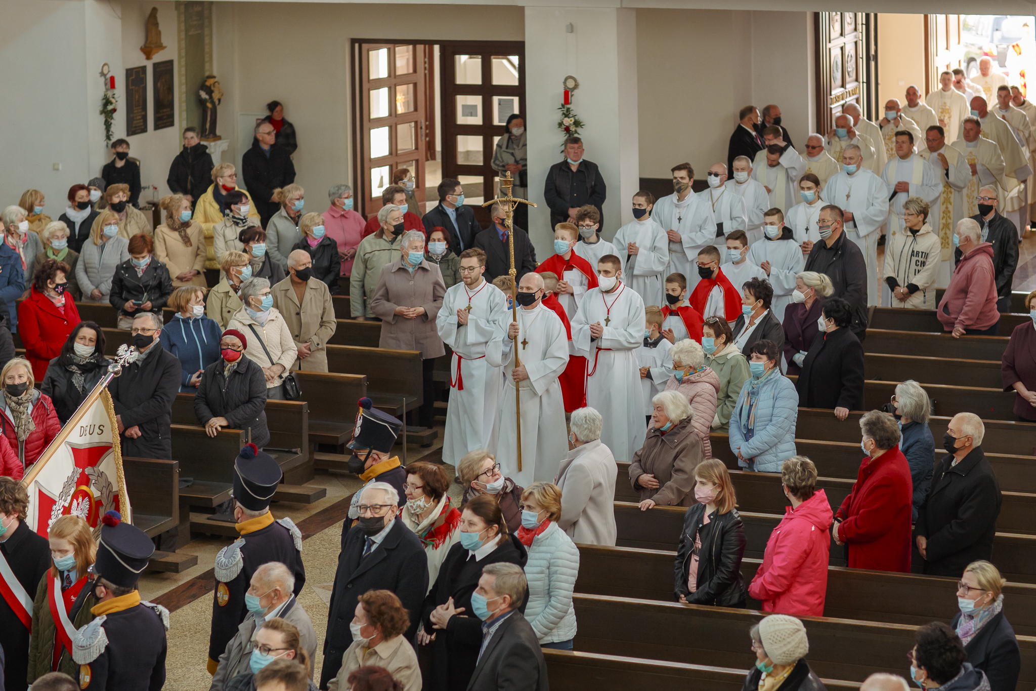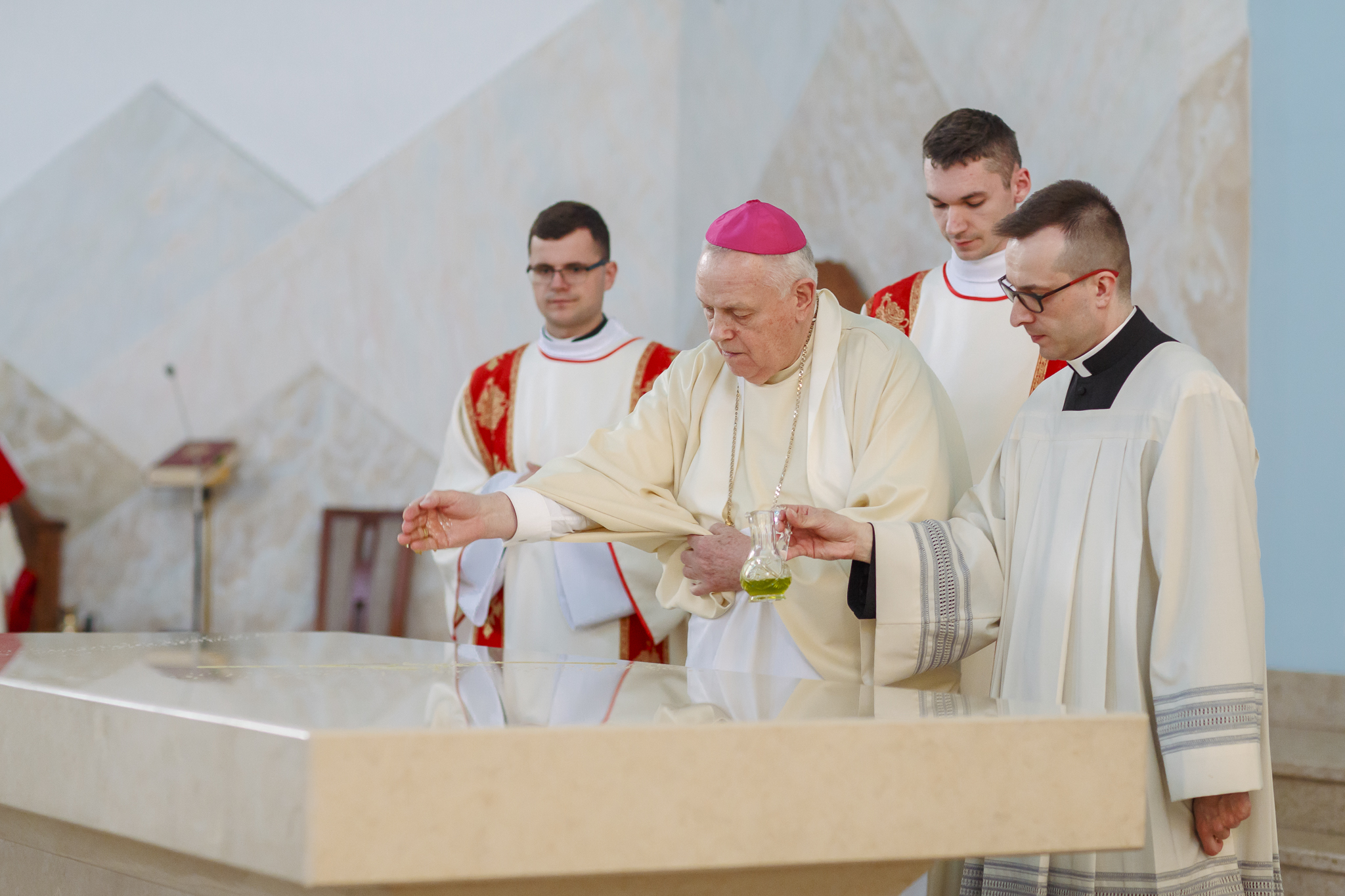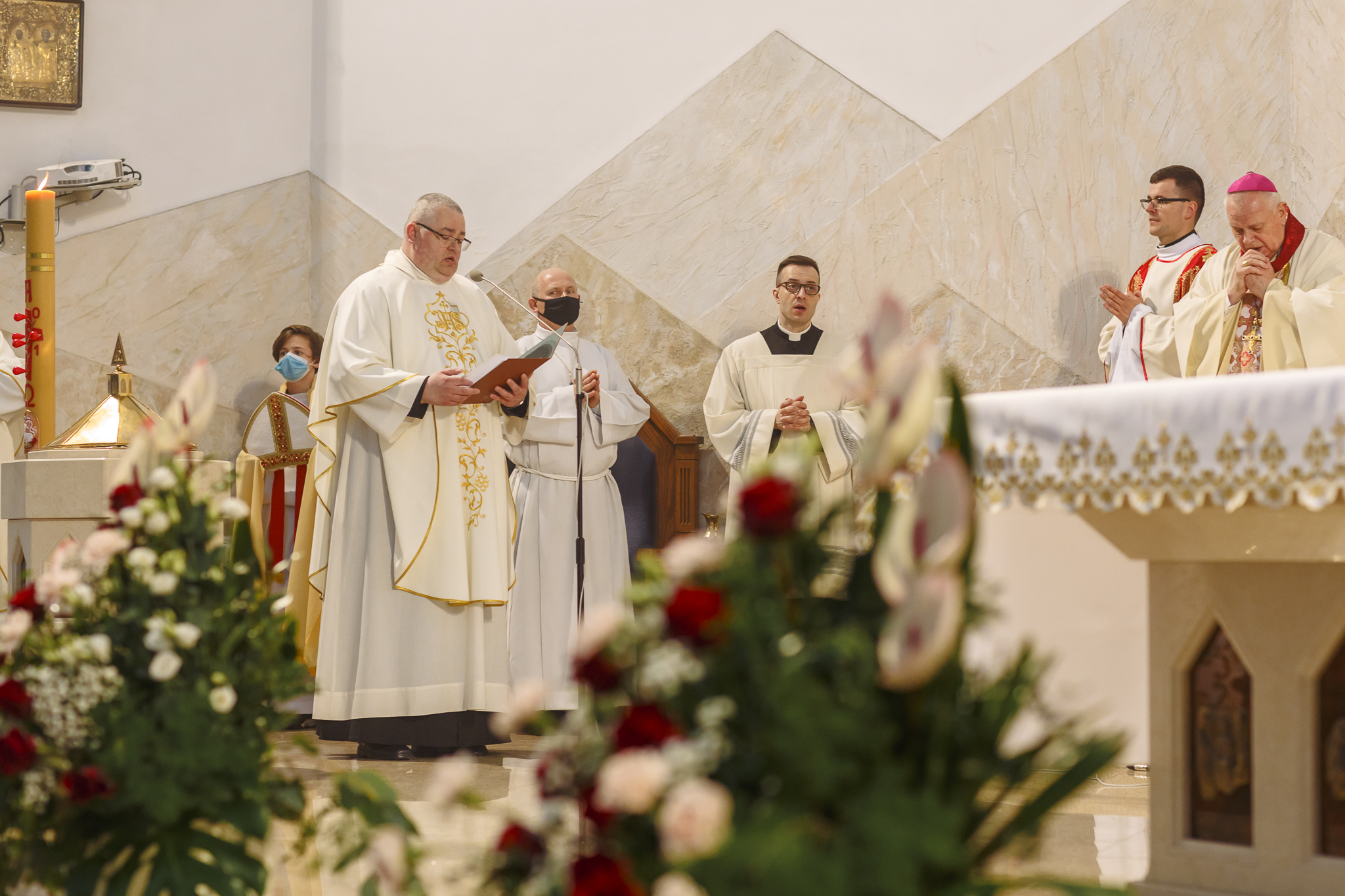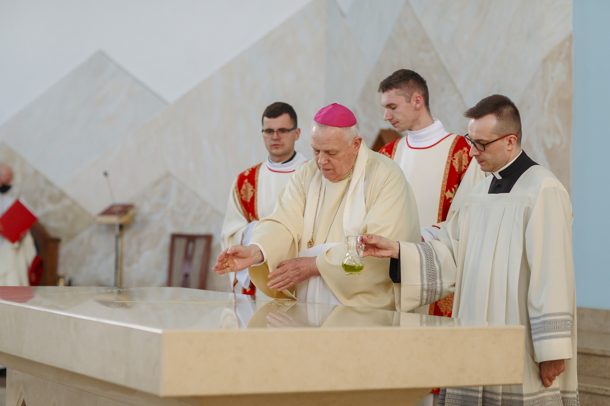 W środę 26 maja 2021 roku nasza Wspólnota Parafialna przeżyła uroczystość poświęcenia kościoła i ołtarza. Liturgii pontyfikalnej przewodniczył Jego Ekscelencja Ksiądz Biskup prof. Zbigniew Kiernikowski - biskup legnicki. Celebracja przy licznym udziale duchowieństwa i wiernych przebiegała według rytu zawartego w Pontyfikale Rzymskim, podczas którego Biskup poświęcił wodę i skropił nią zgromadzonych oraz ołtarz, po śpiewie Litanii do Wszystkich Świętych, odmówił modlitwę poświęcenia, a następnie namaścił ołtarz krzyżmem świętym (12 Zacheuszków, tj. kamieni umieszczonych na 12 filarach świątyni namaścił je w imieniu Biskupa ks. proboszcz). Po najważniejszym momencie obrzędu, ołtarz został uroczyście okadzony, następnie przyobleczony w obrusy, przyozdobiony kwiatami i siedmioma świecami na lichtarzach. Ostatnim momentem była uroczysta iluminacja świątyni, rozpoczynając od zapalenia paschału, świec przy ołtarzu oraz 12 świec przy zacheuszkach.