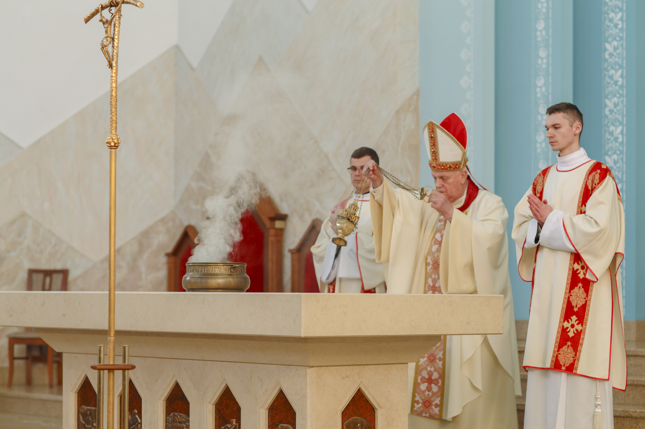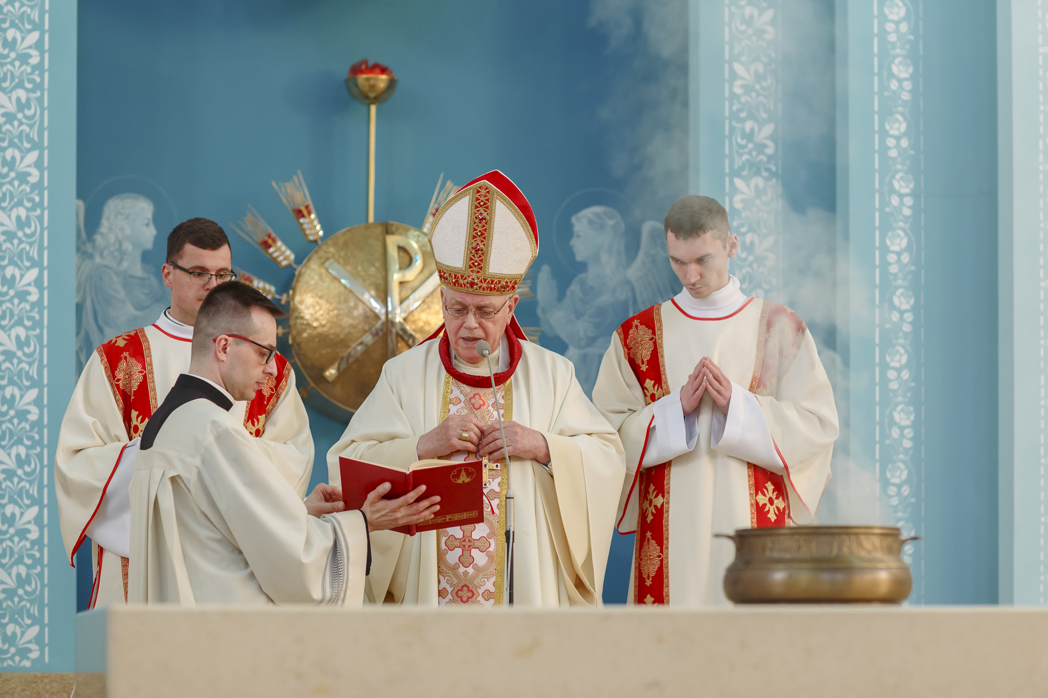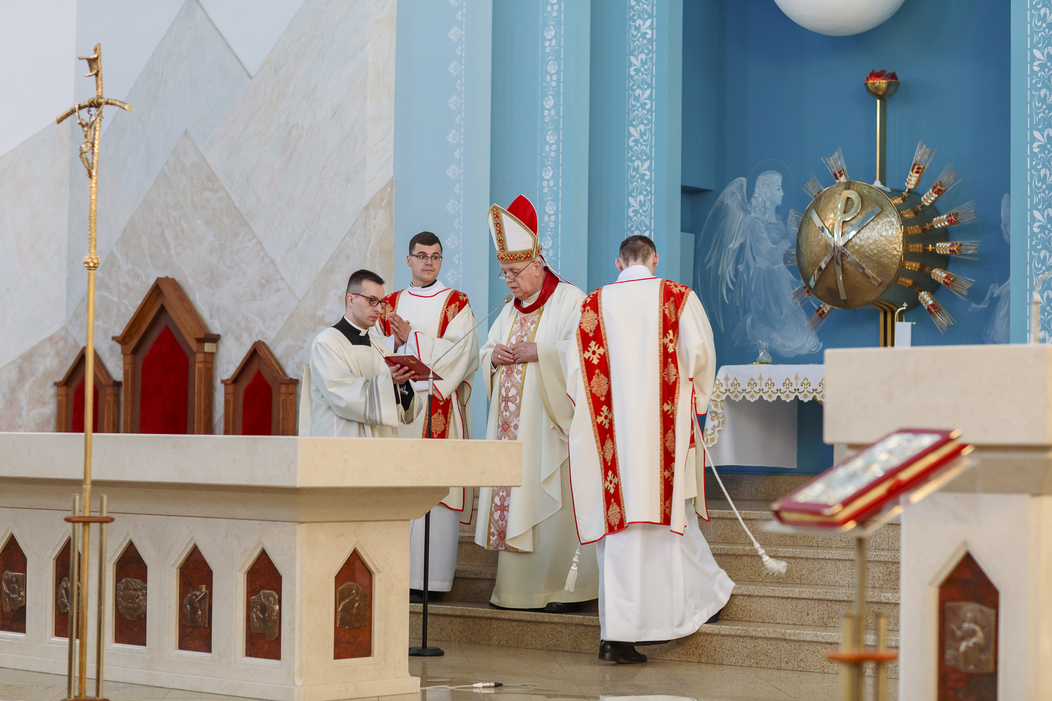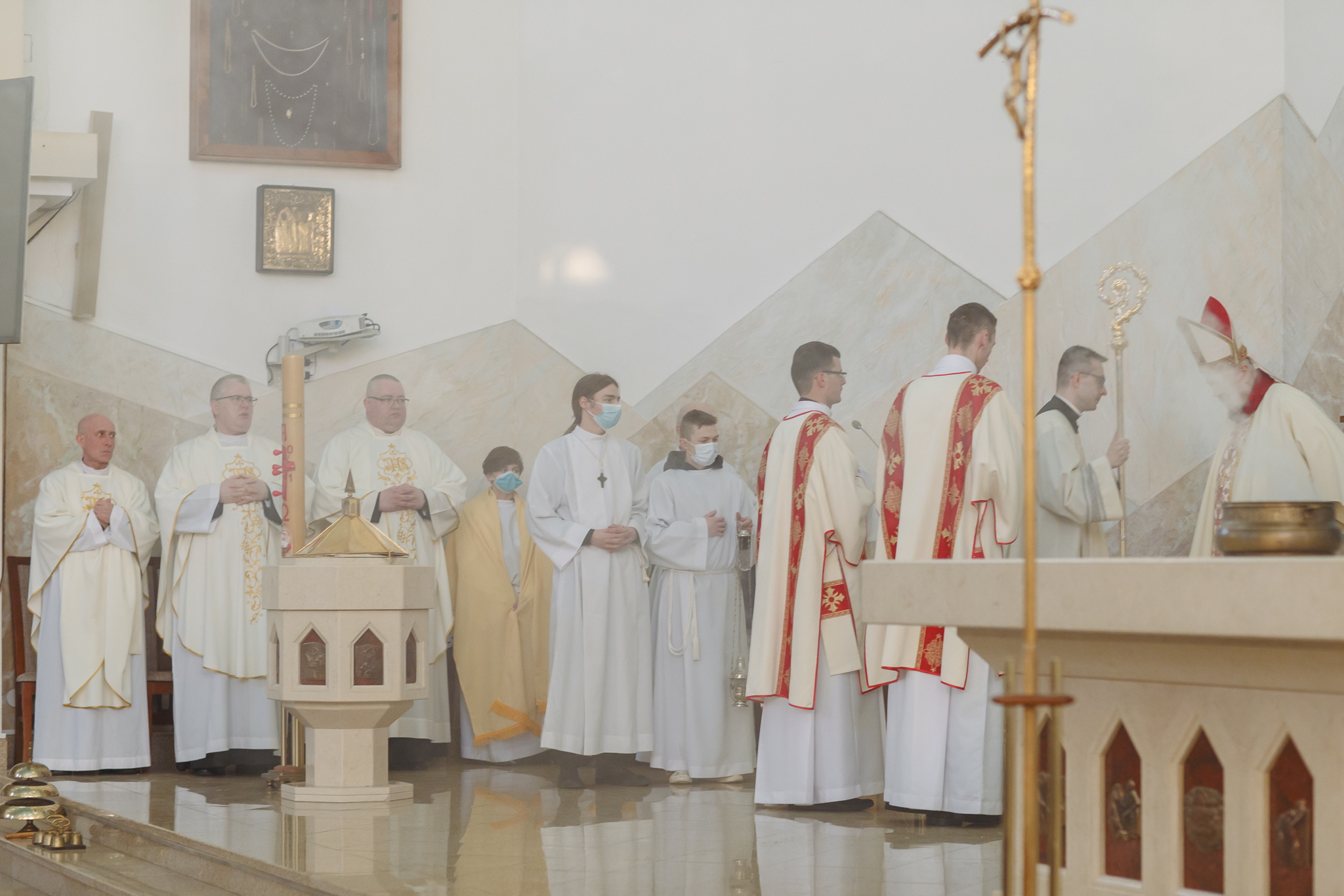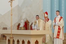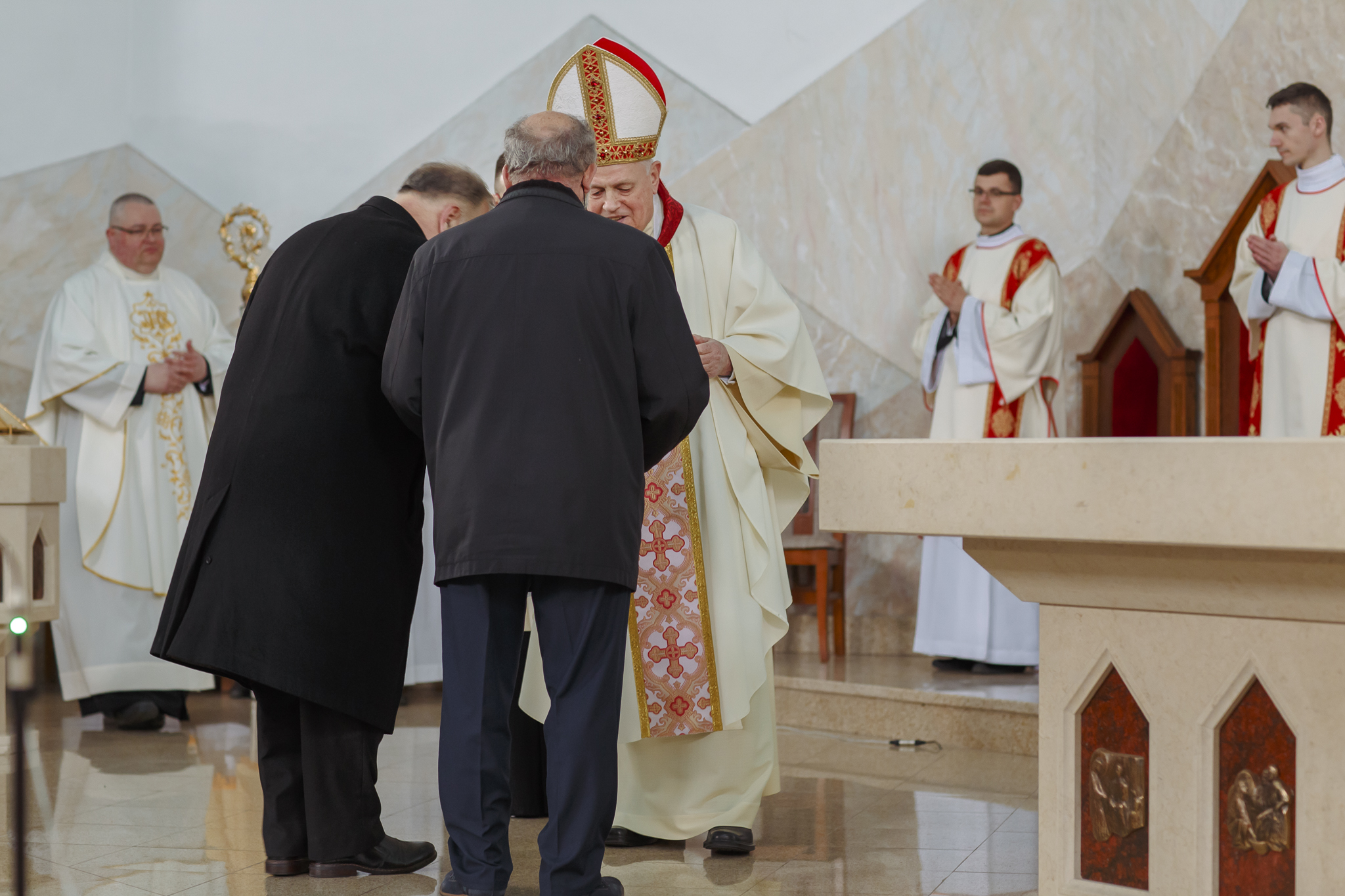 W środę 26 maja 2021 roku nasza Wspólnota Parafialna przeżyła uroczystość poświęcenia kościoła i ołtarza. Liturgii pontyfikalnej przewodniczył Jego Ekscelencja Ksiądz Biskup prof. Zbigniew Kiernikowski - biskup legnicki. Celebracja przy licznym udziale duchowieństwa i wiernych przebiegała według rytu zawartego w Pontyfikale Rzymskim, podczas którego Biskup poświęcił wodę i skropił nią zgromadzonych oraz ołtarz, po śpiewie Litanii do Wszystkich Świętych, odmówił modlitwę poświęcenia, a następnie namaścił ołtarz krzyżmem świętym (12 Zacheuszków, tj. kamieni umieszczonych na 12 filarach świątyni namaścił je w imieniu Biskupa ks. proboszcz). Po najważniejszym momencie obrzędu, ołtarz został uroczyście okadzony, następnie przyobleczony w obrusy, przyozdobiony kwiatami i siedmioma świecami na lichtarzach. Ostatnim momentem była uroczysta iluminacja świątyni, rozpoczynając od zapalenia paschału, świec przy ołtarzu oraz 12 świec przy zacheuszkach.