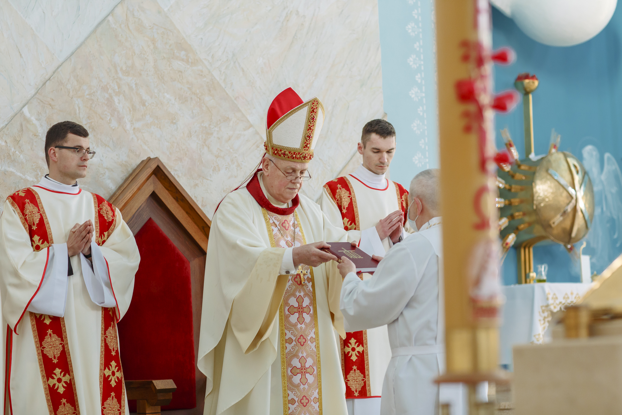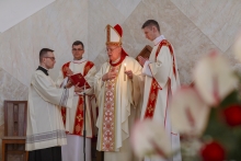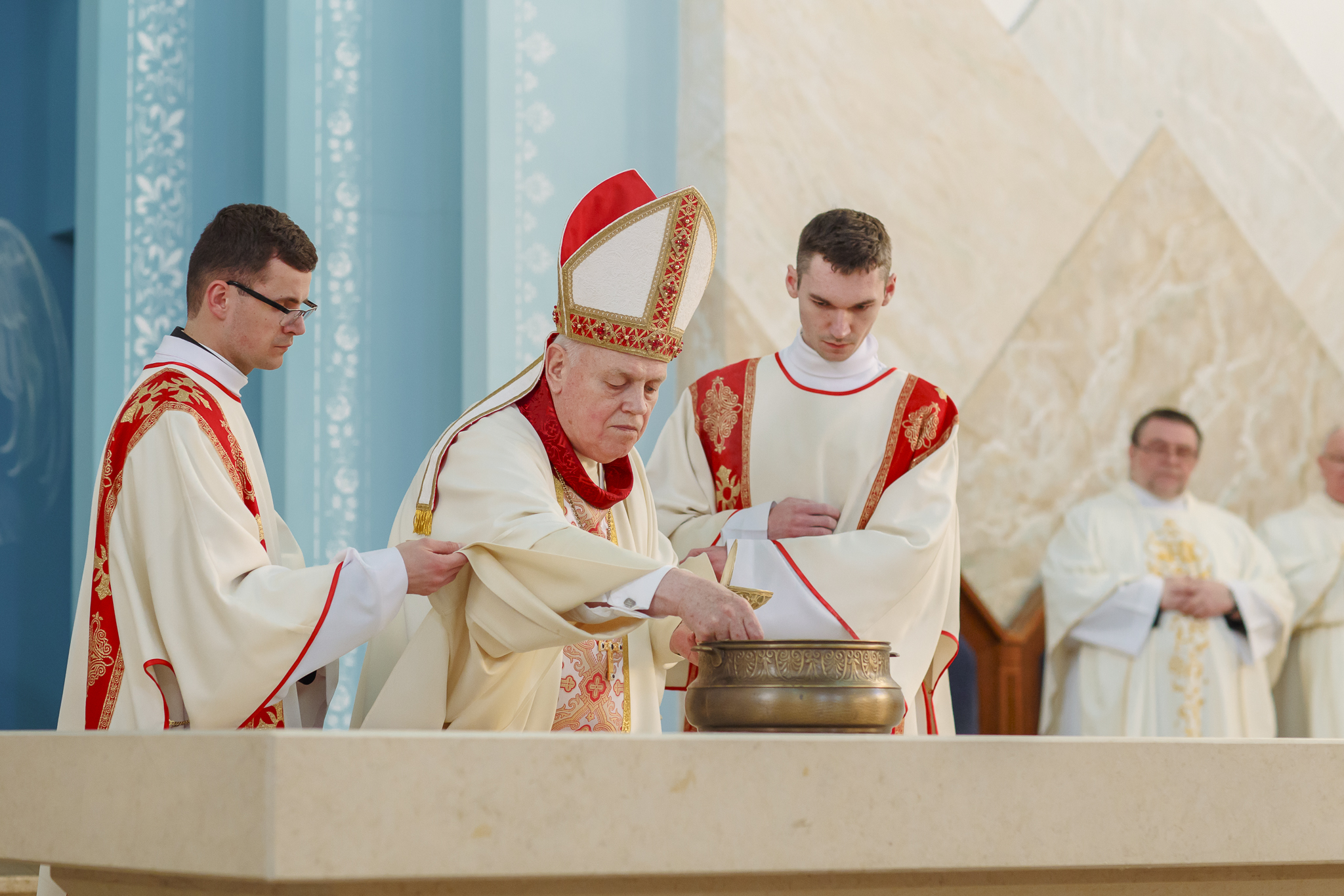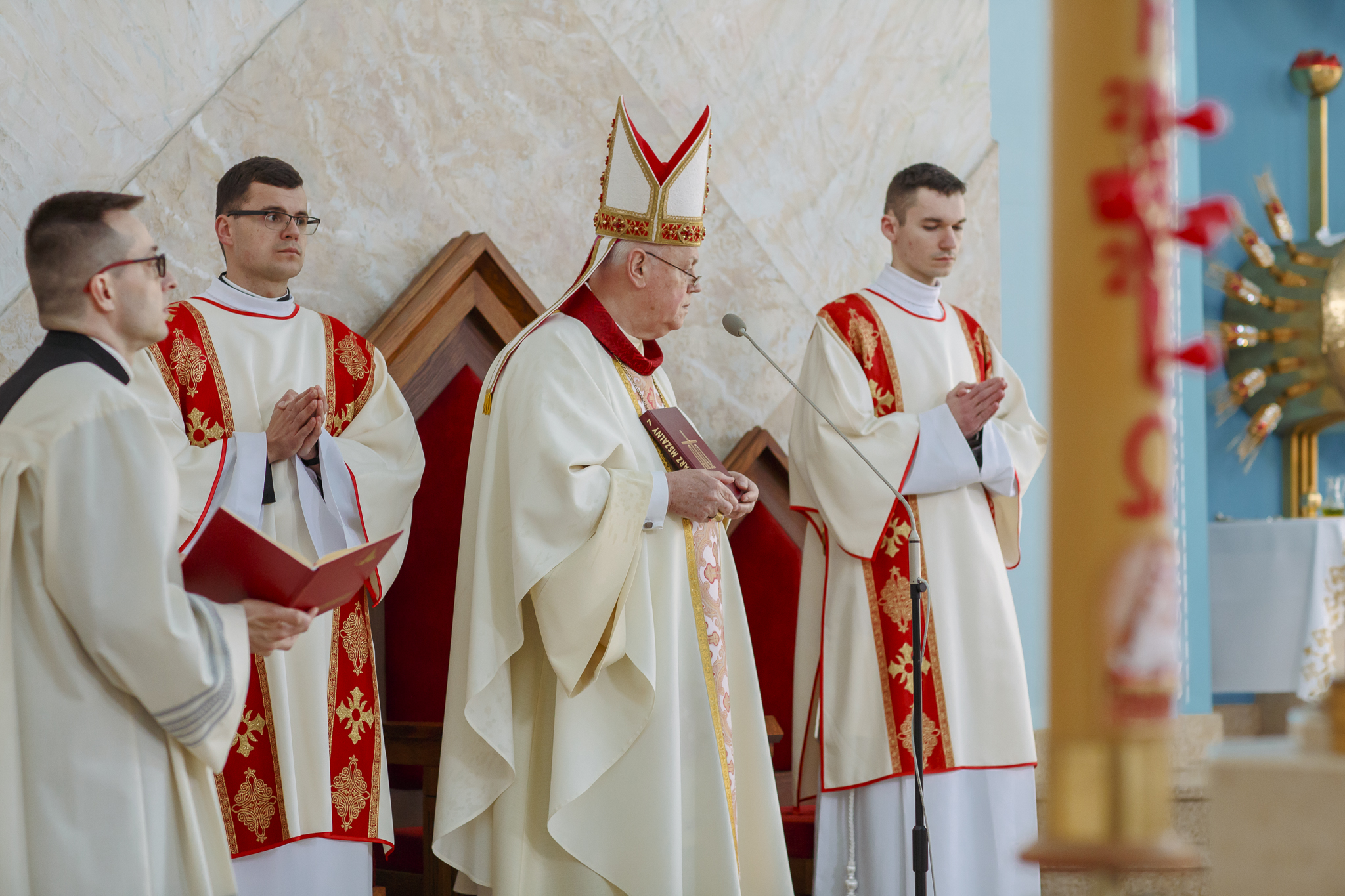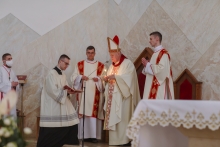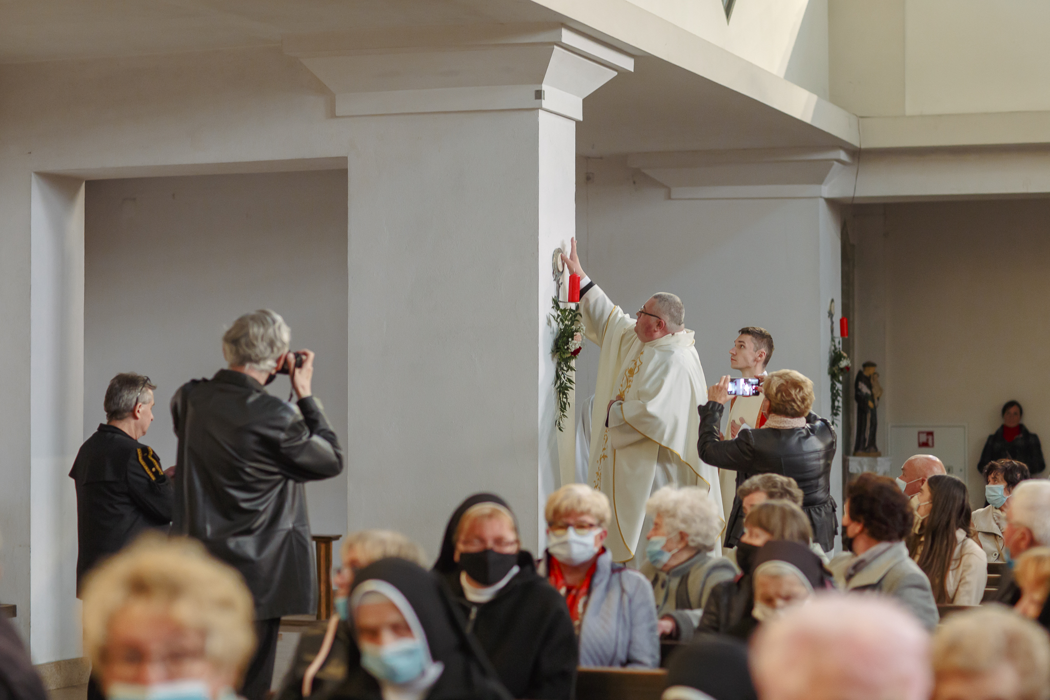 W środę 26 maja 2021 roku nasza Wspólnota Parafialna przeżyła uroczystość poświęcenia kościoła i ołtarza. Liturgii pontyfikalnej przewodniczył Jego Ekscelencja Ksiądz Biskup prof. Zbigniew Kiernikowski - biskup legnicki. Celebracja przy licznym udziale duchowieństwa i wiernych przebiegała według rytu zawartego w Pontyfikale Rzymskim, podczas którego Biskup poświęcił wodę i skropił nią zgromadzonych oraz ołtarz, po śpiewie Litanii do Wszystkich Świętych, odmówił modlitwę poświęcenia, a następnie namaścił ołtarz krzyżmem świętym (12 Zacheuszków, tj. kamieni umieszczonych na 12 filarach świątyni namaścił je w imieniu Biskupa ks. proboszcz). Po najważniejszym momencie obrzędu, ołtarz został uroczyście okadzony, następnie przyobleczony w obrusy, przyozdobiony kwiatami i siedmioma świecami na lichtarzach. Ostatnim momentem była uroczysta iluminacja świątyni, rozpoczynając od zapalenia paschału, świec przy ołtarzu oraz 12 świec przy zacheuszkach.
