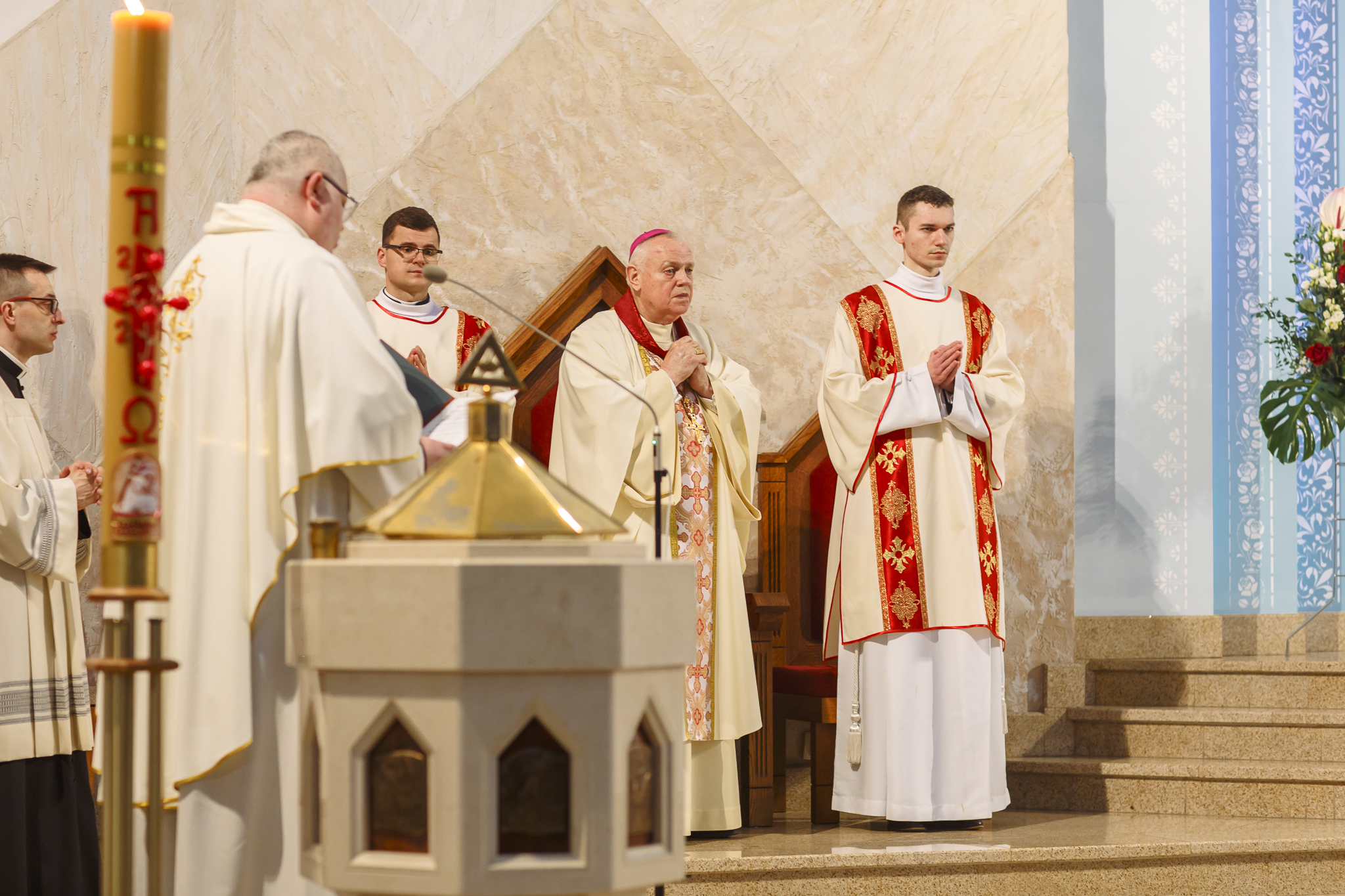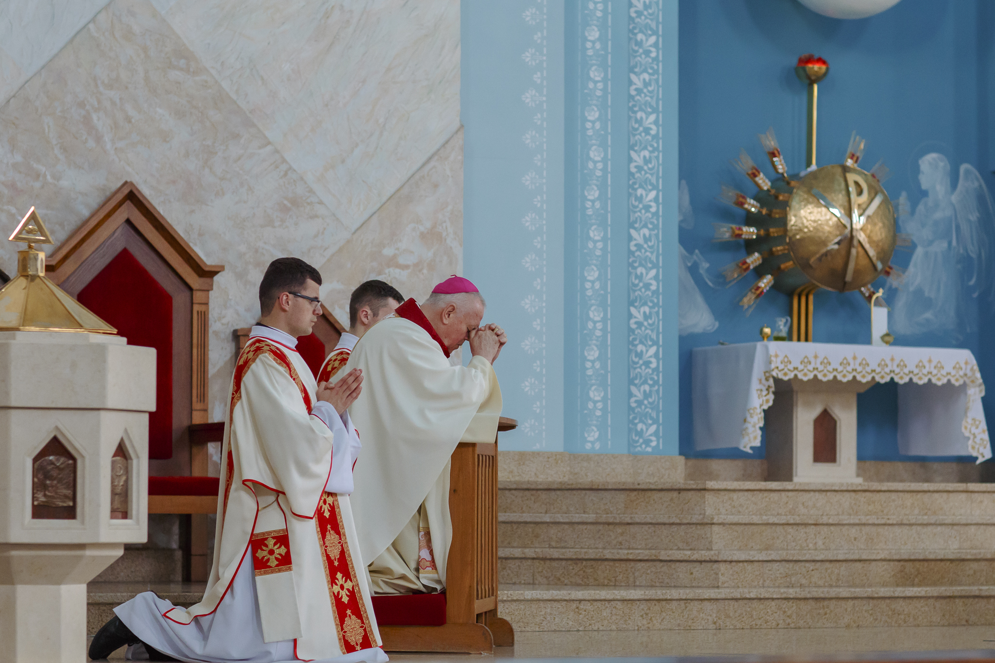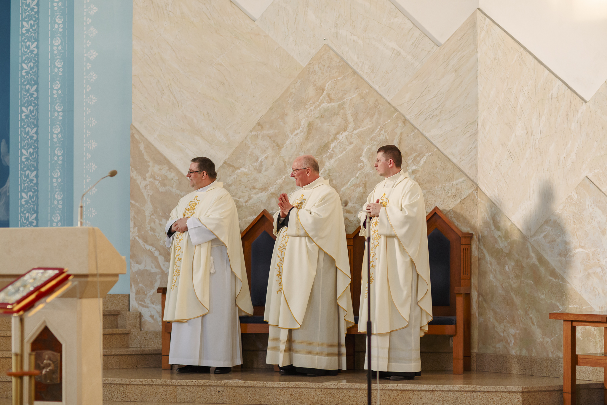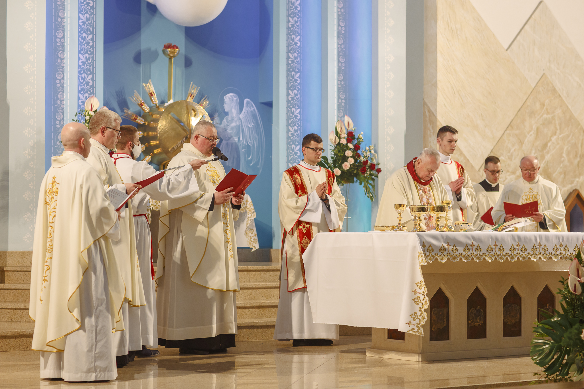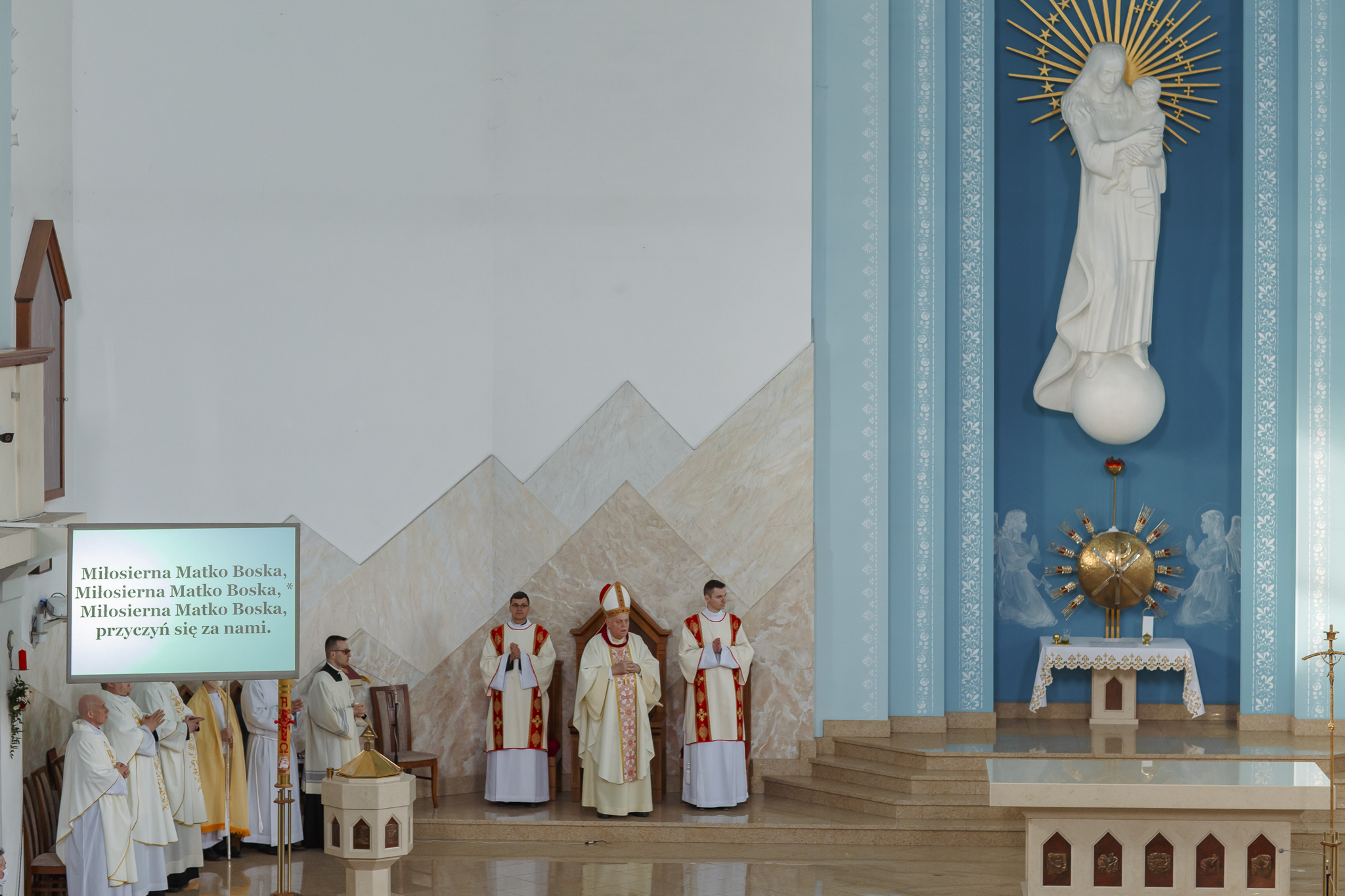 W środę 26 maja 2021 roku nasza Wspólnota Parafialna przeżyła uroczystość poświęcenia kościoła i ołtarza. Liturgii pontyfikalnej przewodniczył Jego Ekscelencja Ksiądz Biskup prof. Zbigniew Kiernikowski - biskup legnicki. Celebracja przy licznym udziale duchowieństwa i wiernych przebiegała według rytu zawartego w Pontyfikale Rzymskim, podczas którego Biskup poświęcił wodę i skropił nią zgromadzonych oraz ołtarz, po śpiewie Litanii do Wszystkich Świętych, odmówił modlitwę poświęcenia, a następnie namaścił ołtarz krzyżmem świętym (12 Zacheuszków, tj. kamieni umieszczonych na 12 filarach świątyni namaścił je w imieniu Biskupa ks. proboszcz). Po najważniejszym momencie obrzędu, ołtarz został uroczyście okadzony, następnie przyobleczony w obrusy, przyozdobiony kwiatami i siedmioma świecami na lichtarzach. Ostatnim momentem była uroczysta iluminacja świątyni, rozpoczynając od zapalenia paschału, świec przy ołtarzu oraz 12 świec przy zacheuszkach.