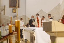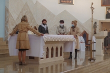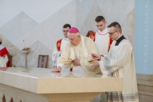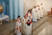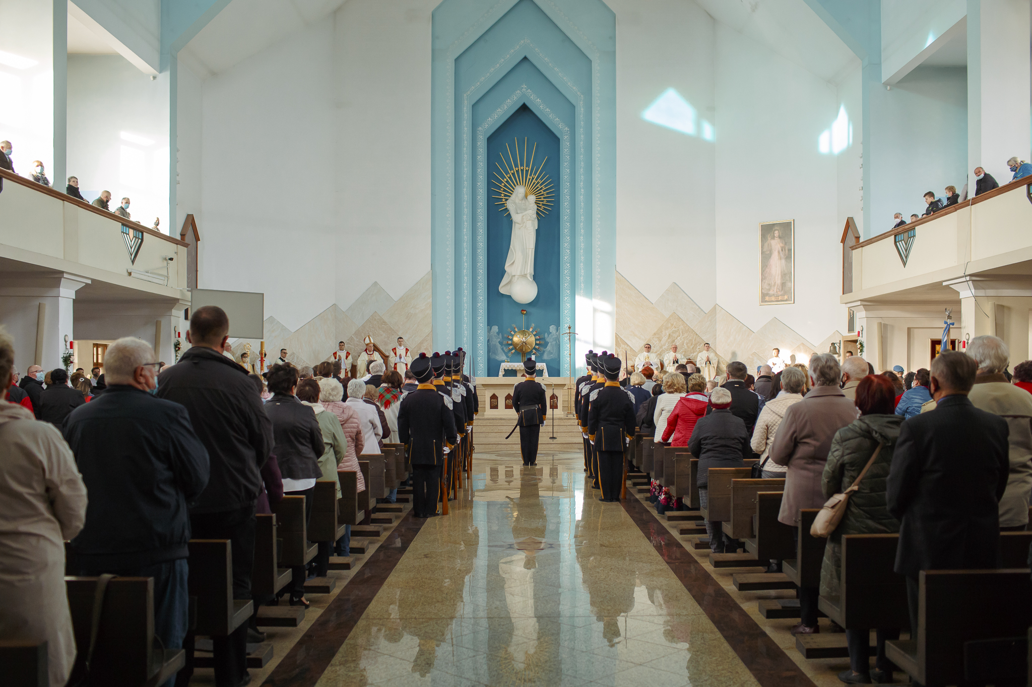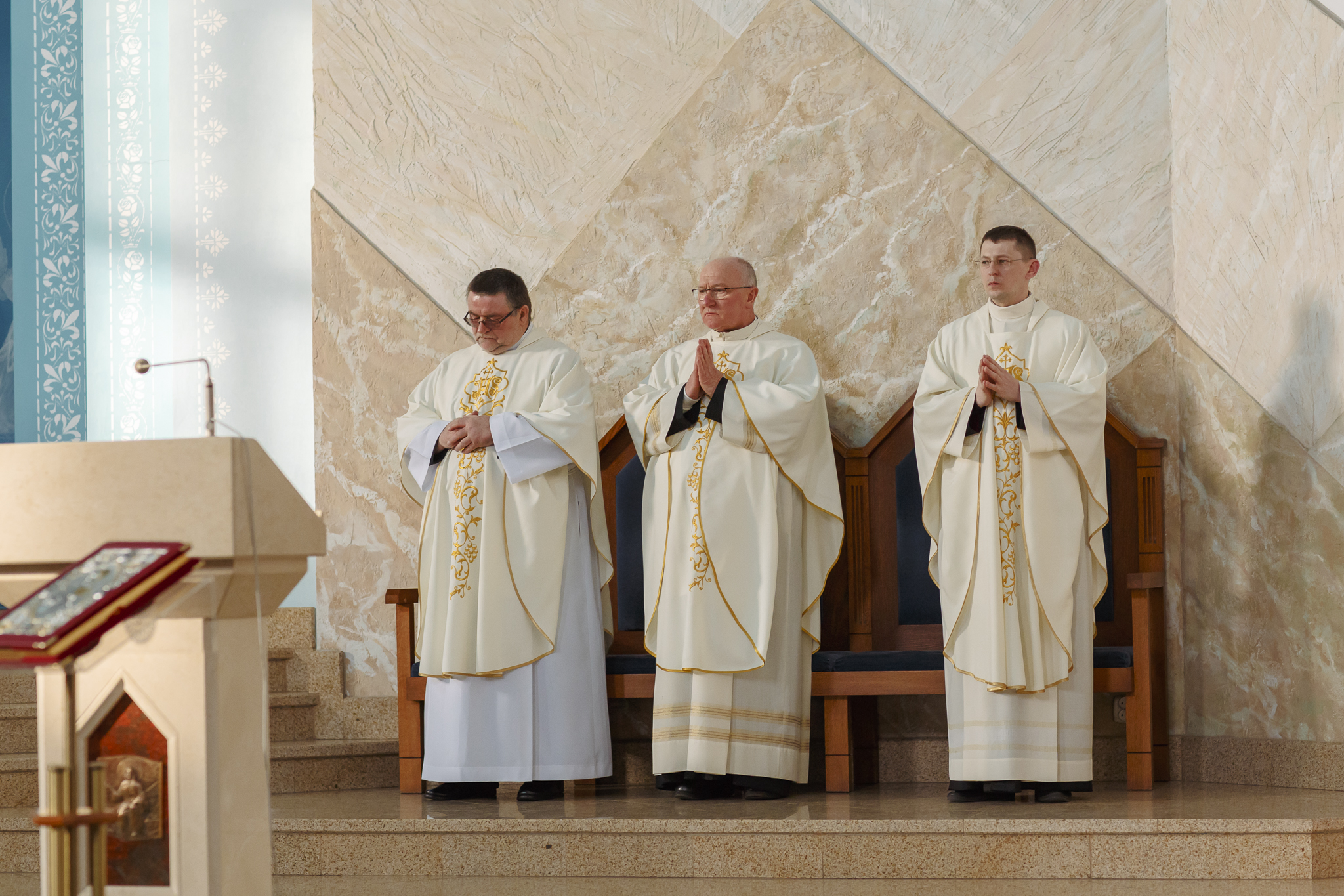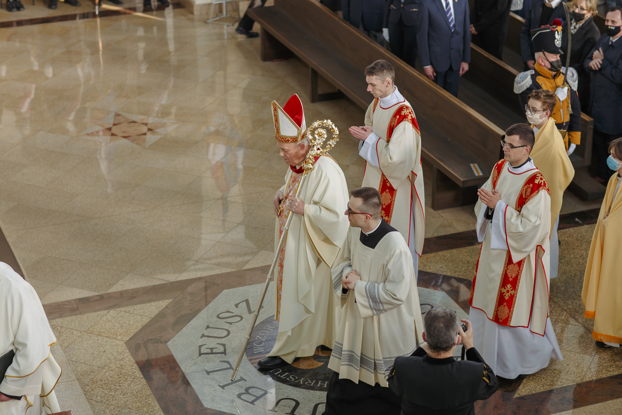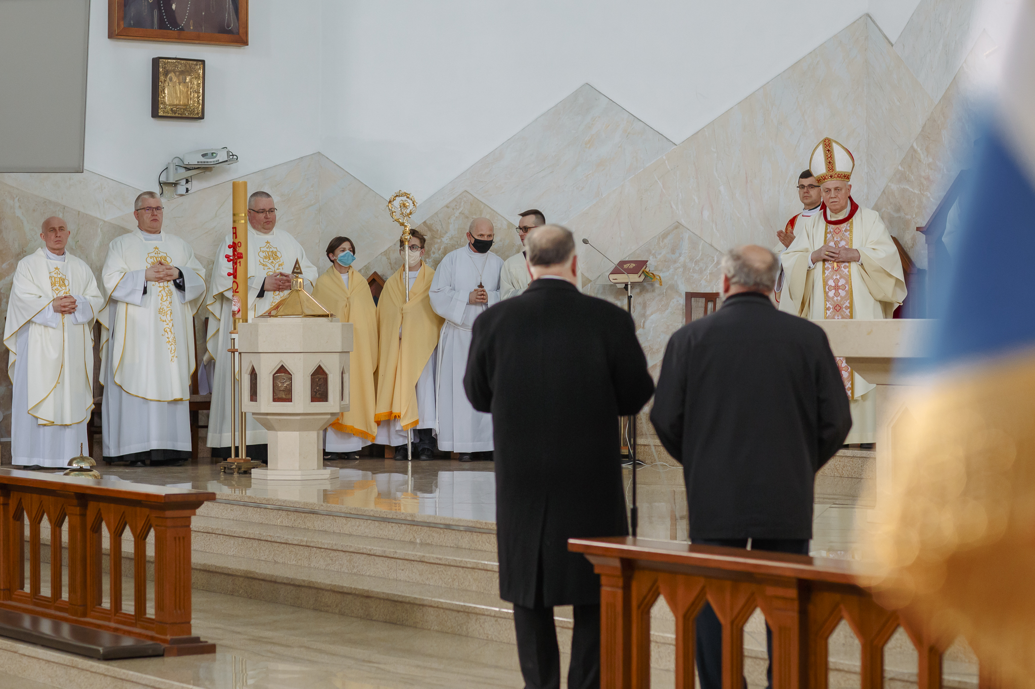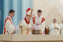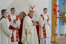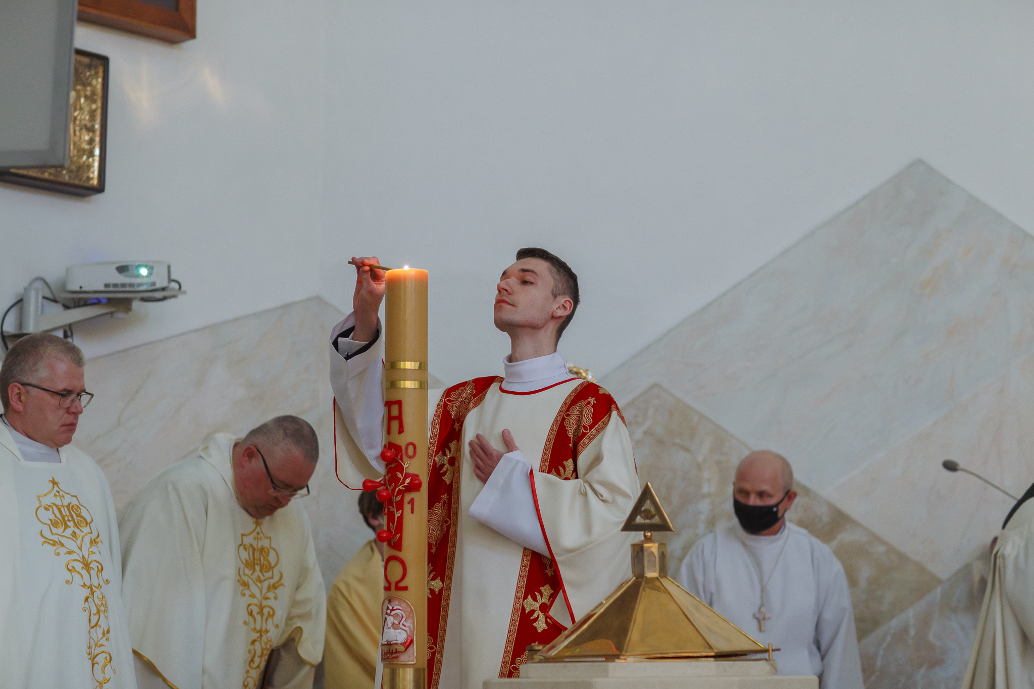 W środę 26 maja 2021 roku nasza Wspólnota Parafialna przeżyła uroczystość poświęcenia kościoła i ołtarza. Liturgii pontyfikalnej przewodniczył Jego Ekscelencja Ksiądz Biskup prof. Zbigniew Kiernikowski - biskup legnicki. Celebracja przy licznym udziale duchowieństwa i wiernych przebiegała według rytu zawartego w Pontyfikale Rzymskim, podczas którego Biskup poświęcił wodę i skropił nią zgromadzonych oraz ołtarz, po śpiewie Litanii do Wszystkich Świętych, odmówił modlitwę poświęcenia, a następnie namaścił ołtarz krzyżmem świętym (12 Zacheuszków, tj. kamieni umieszczonych na 12 filarach świątyni namaścił je w imieniu Biskupa ks. proboszcz). Po najważniejszym momencie obrzędu, ołtarz został uroczyście okadzony, następnie przyobleczony w obrusy, przyozdobiony kwiatami i siedmioma świecami na lichtarzach. Ostatnim momentem była uroczysta iluminacja świątyni, rozpoczynając od zapalenia paschału, świec przy ołtarzu oraz 12 świec przy zacheuszkach.
