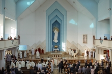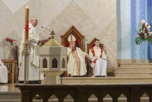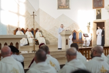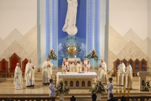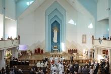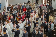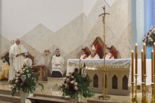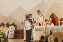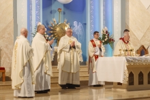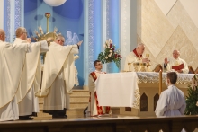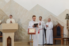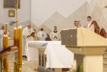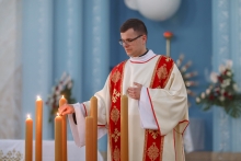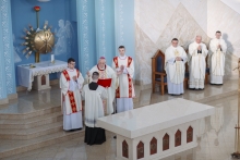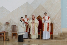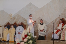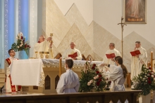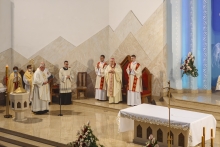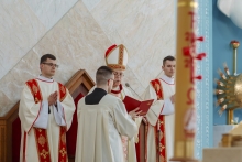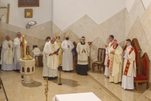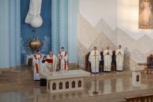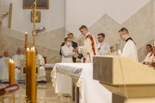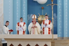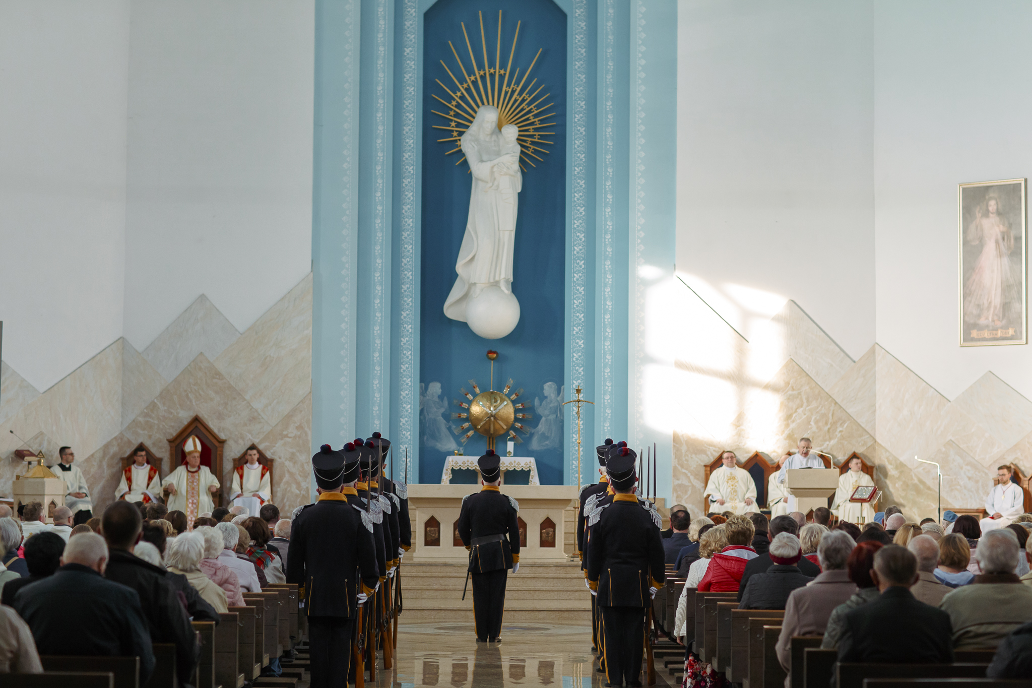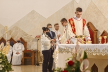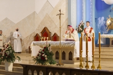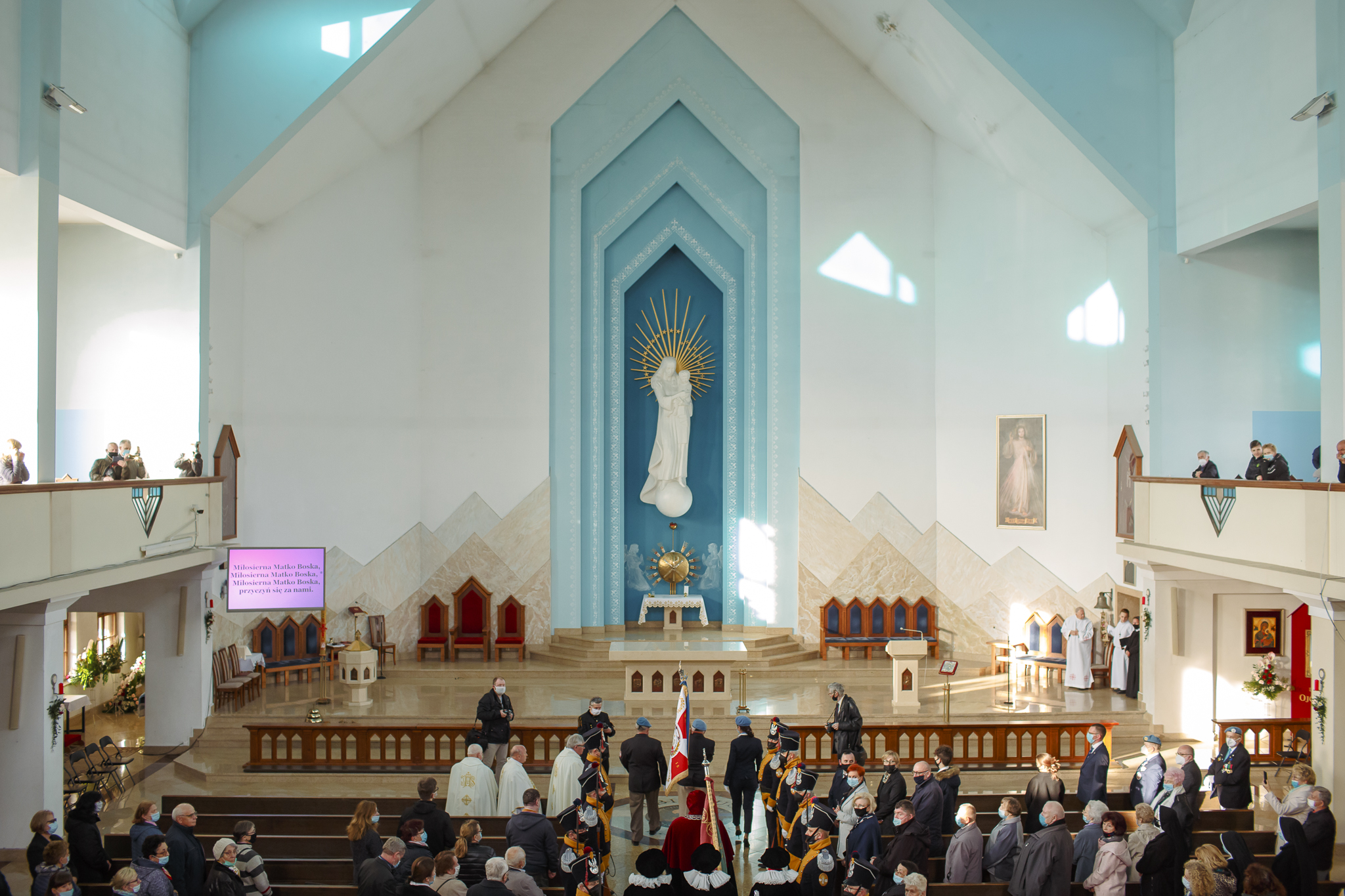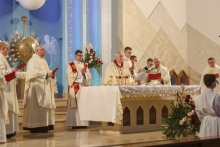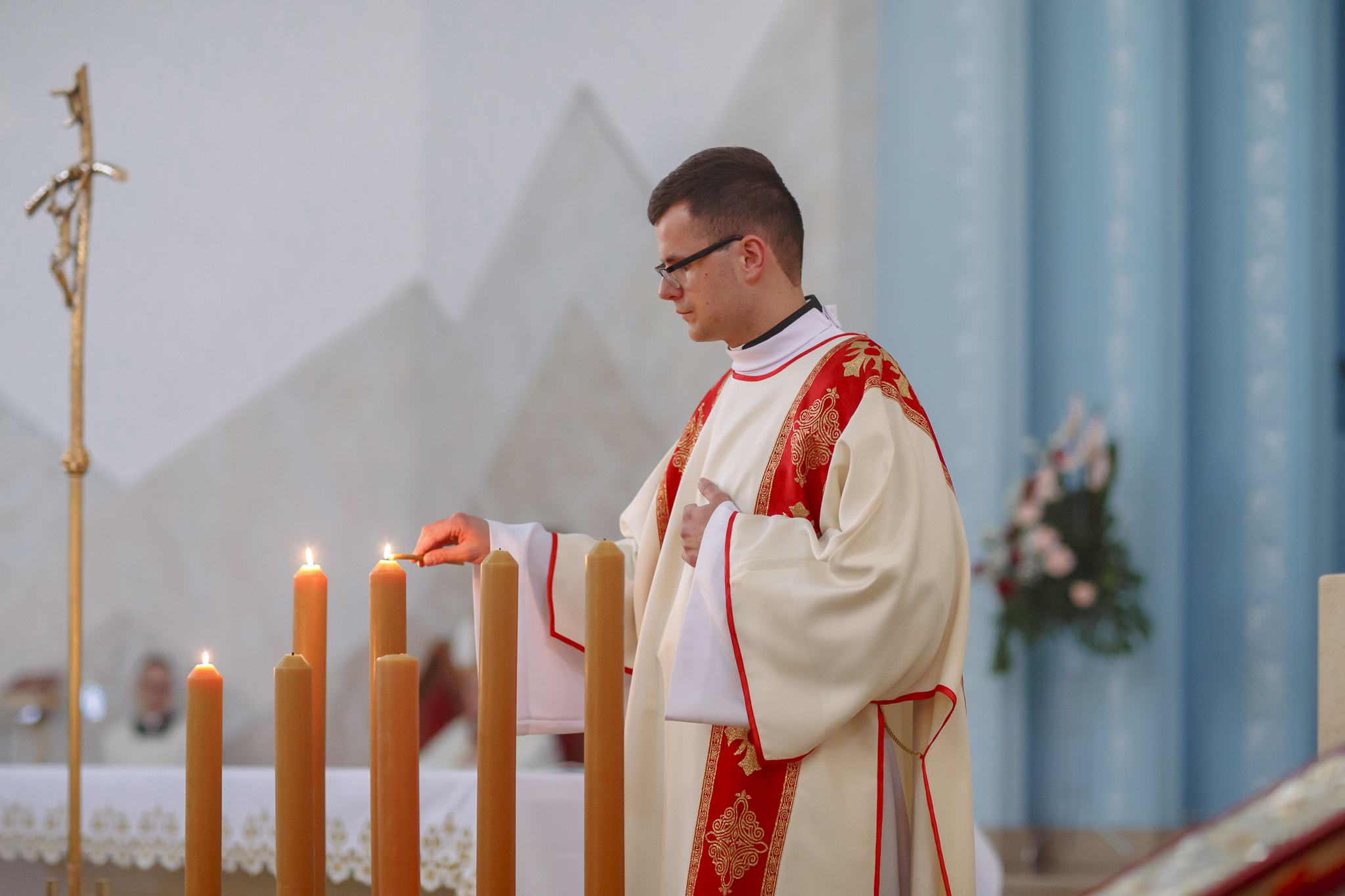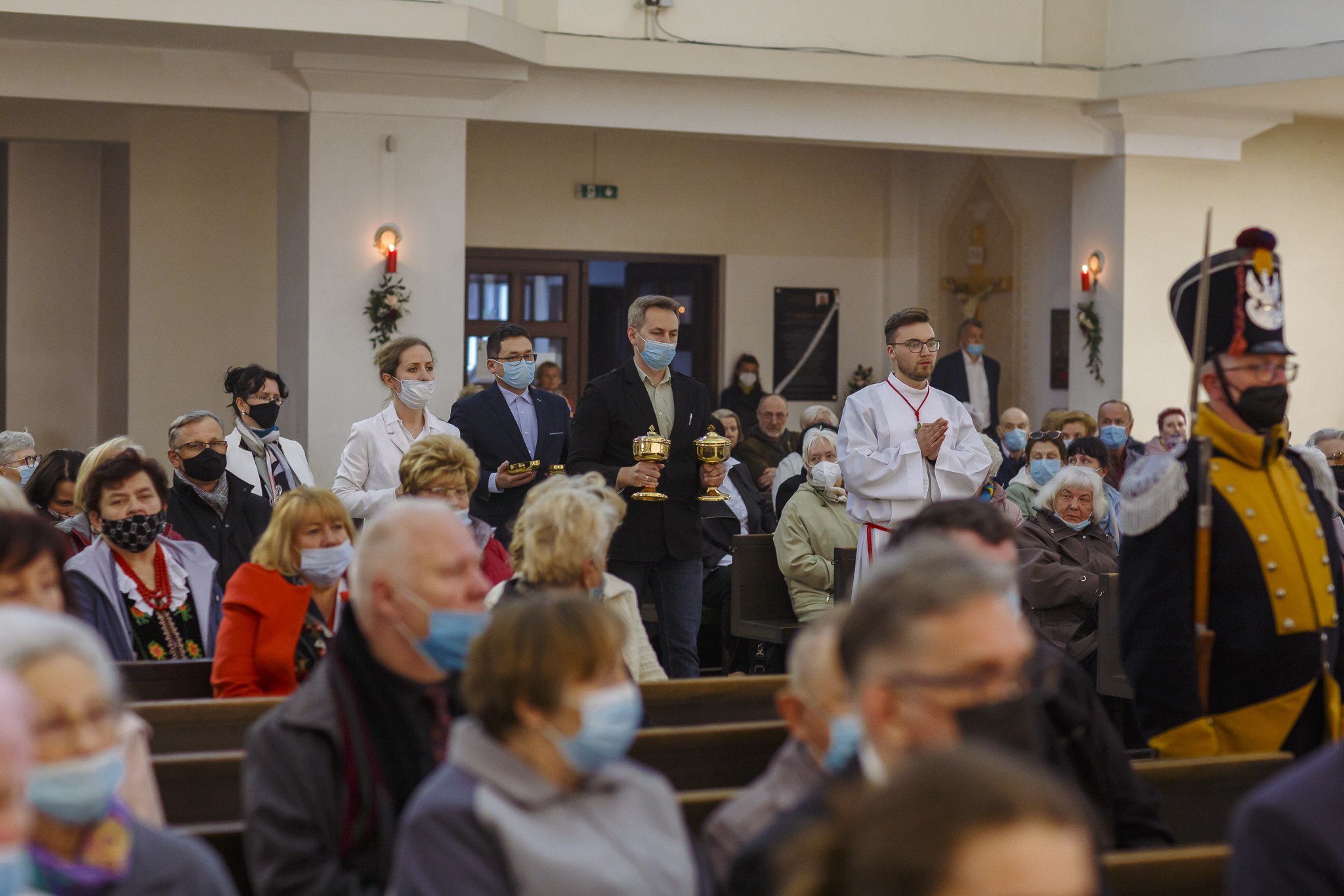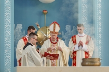 W środę 26 maja 2021 roku nasza Wspólnota Parafialna przeżyła uroczystość poświęcenia kościoła i ołtarza. Liturgii pontyfikalnej przewodniczył Jego Ekscelencja Ksiądz Biskup prof. Zbigniew Kiernikowski - biskup legnicki. Celebracja przy licznym udziale duchowieństwa i wiernych przebiegała według rytu zawartego w Pontyfikale Rzymskim, podczas którego Biskup poświęcił wodę i skropił nią zgromadzonych oraz ołtarz, po śpiewie Litanii do Wszystkich Świętych, odmówił modlitwę poświęcenia, a następnie namaścił ołtarz krzyżmem świętym (12 Zacheuszków, tj. kamieni umieszczonych na 12 filarach świątyni namaścił je w imieniu Biskupa ks. proboszcz). Po najważniejszym momencie obrzędu, ołtarz został uroczyście okadzony, następnie przyobleczony w obrusy, przyozdobiony kwiatami i siedmioma świecami na lichtarzach. Ostatnim momentem była uroczysta iluminacja świątyni, rozpoczynając od zapalenia paschału, świec przy ołtarzu oraz 12 świec przy zacheuszkach.