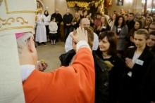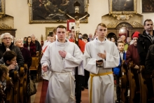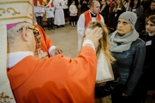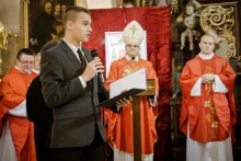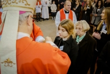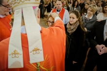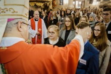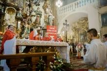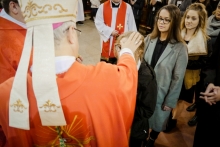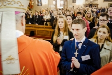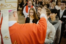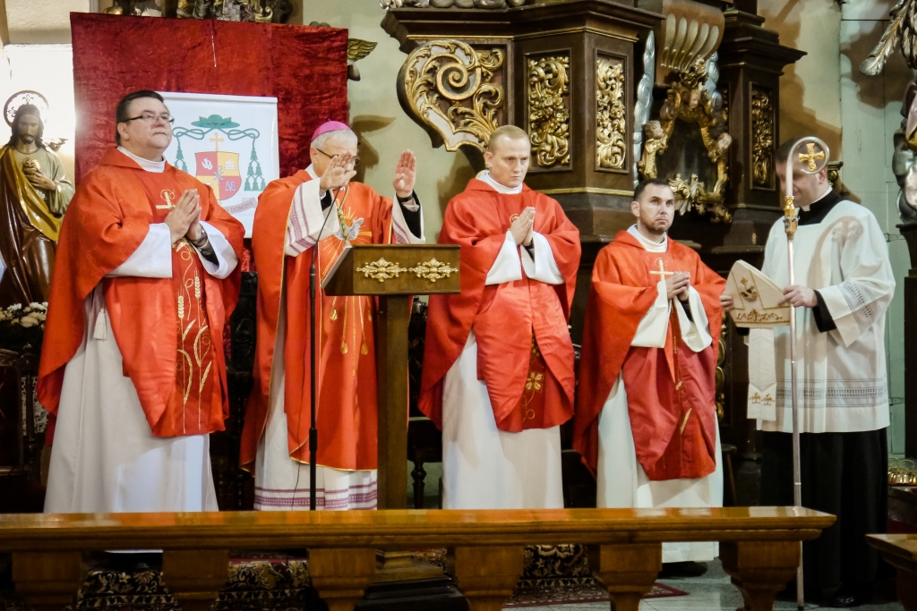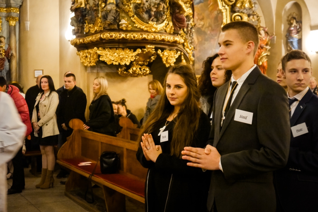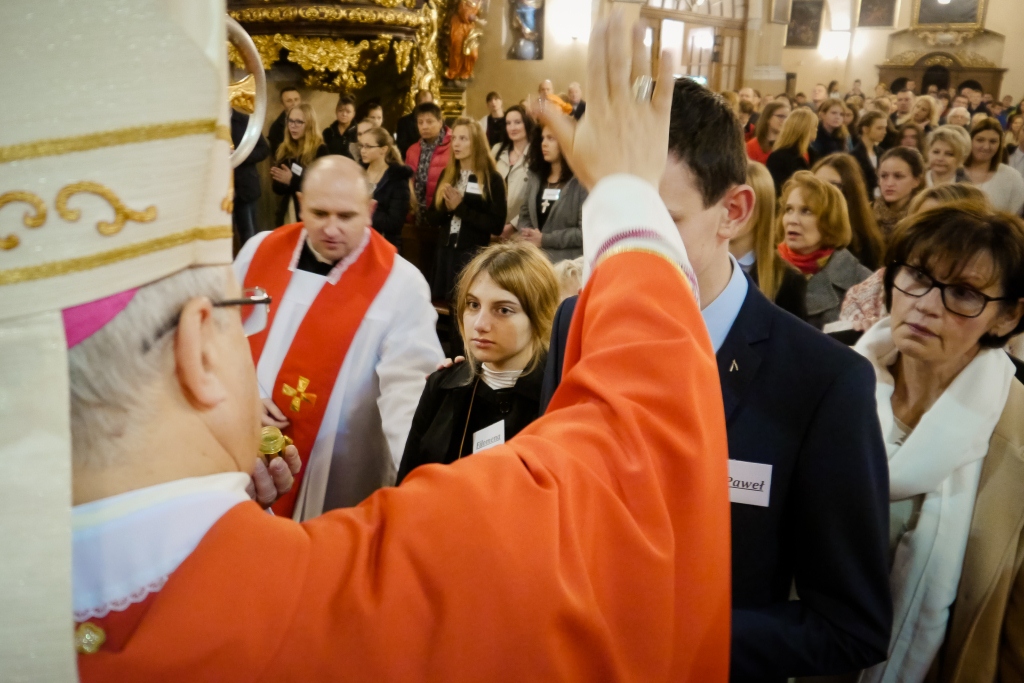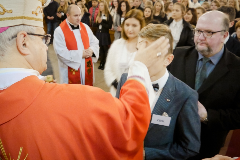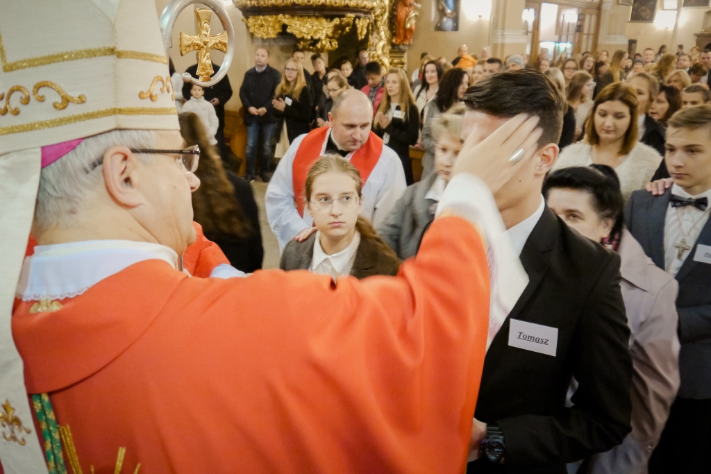 19 października 2016 roku miała miejsce piękna uroczystość. W kościele pw. Św. Jana Chrzciciele 39 osób z tamtejszej i naszej parafii przystąpiło do sakramentu bierzmowania, któremu przewodniczył Jego Ekscelencja Ksiądz Biskup Marek Mendyk - Biskup pomocniczy diecezji legnickiej. Liturgia rozpoczęła się o godz. 17:00 uroczystym powitaniem przez rodziców i proboszcza - o. Stefana Wojdę. Każdy, przystępujący w tym dniu do bierzmowania miał wybrać sobie swojego patrona i w liście do Księdza Biskupa uzasadnić swój wybór. Niektóre teksty zostały zacytowane podczas kazania skierowanego do młodych. Ku wielkiej radości zgromadzonych w świątyni wiernych, na Eucharystię udało się przyjechać również Księdzu Tomaszowi Kołodziejowi - obecnemu prefektowi legnickiego seminarium, który przez 3 lata przygotowywał młodzież z naszej parafii do przyjęcia darów Ducha Świętego. Muzycznie liturgię ubogacali pan organista i diakonia muzyczna parafii Matki Bożej Miłosierdzia. Na koniec nie zabrakło serdecznych podziękowań i słów uznania dla księdza biskupa, ks. Łukasza Frątczaka, o. Łukasza Porąbki, animatorek grup formacyjnych - P. Basi, P. Eli, S. Bożenie, P. Agnieszce, S. Alinie, rodziców, świadków i wszystkich osób, które w jakikolwiek sposób przyczyniły się do ubogacenia uroczystości.