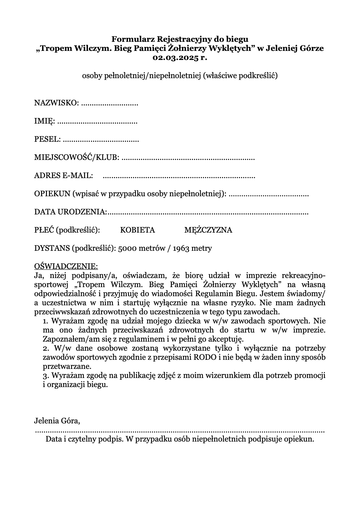 Trasa biegu: „Tropem Wilczym. Bieg Pamięci Żołnierzy Wyklętych” Jelenia Góra składa się w przypadku Biegu Rodzinnego - z jednego okrążenia o długości 1963 m oraz w Biegu na 5000 m z niepełnych trzech okrążeń i jest trasą o niskim nachyleniu terenu. Start oraz meta znajdują się w północnej części Parku nieopodal Pawilonu Norweskiego - dawniej budynku Muzeum Przyrodniczego przy podeście widowiskowym. Trasa biegnie głównymi alejkami parku i rozpoczyna się prostą, a potem skręca w lewo wiodąc dalej dookoła parku jego alejkami. Trasa biegu w większości swej długości pokrywa się z najdłuższą trasą ParkRun. Trasa będzie dokładnie oznakowana znakami poziomymi (strzałki i linie ciągłe na podłożu wykonane farbą luminescencyjną) i pionowymi (taśma biało czerwona przymocowana do drzew, latarni i słupów na wysokości wzroku. Start i meta wyodrębnione będą szpalerami tyczek połączonych biało czerwoną taśmą. Stoisko gastronomiczne serwować będzie bigos i ciepłe napoje. ZAPRASZAMY!