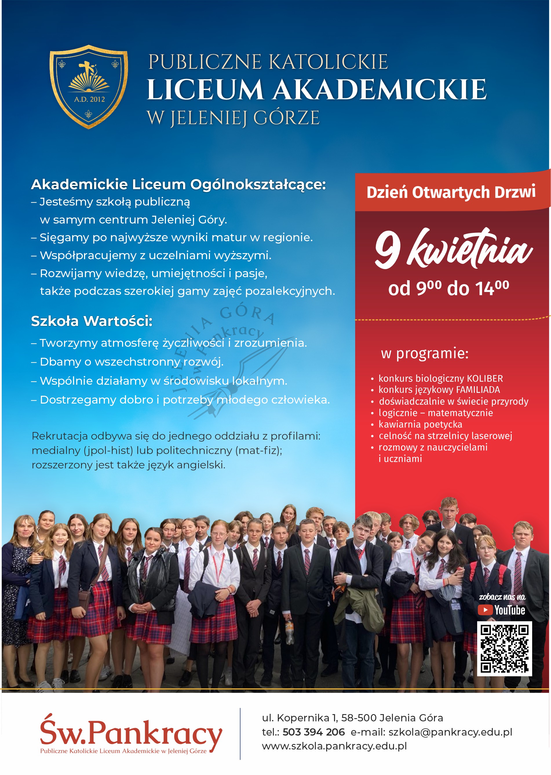 Katolickie Liceum Akademickie zaprasza na „Dzień otwartych drzwi”, który odbędzie się w środę 9 kwietnia w godz. 10-14, w budynku przy ul. Kopernika 1 (obok bazyliki).