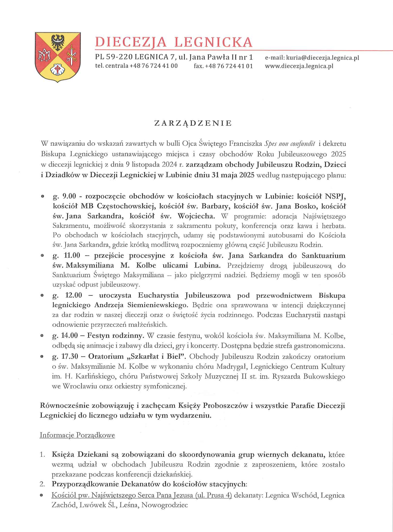 Zaparszamy na Jubileusz Rodzin, Dzieci, Dziadków i Osób Starszych, który odbędzie się w sobotę 31 maja w Lubinie. Z naszego dekanatu organizujemy wyjazd autokarowy. Koszt przejazdu to 50 zł (zapisy w zakrystii). Wyjazd z parkingu przy naszym kościele w sobotę 31 maja o godz. 7:00, powrót ok. godz. 18.