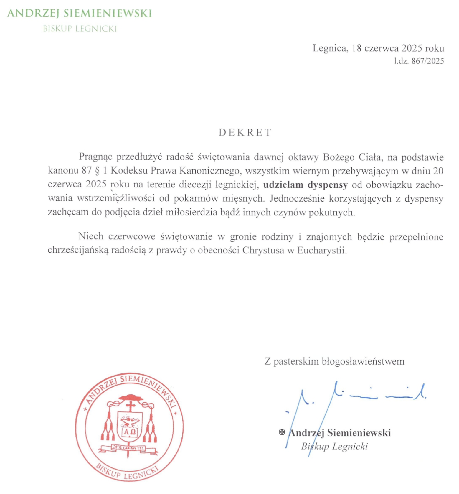 Wysłane przez Mariusz Majewski w śr., 06/18/2025 - 14:42 Biskup Legnicki na piątek 20 czerwca 2025 r., dla katolików przebywających na terenie dioecezji legnickiej, udzielił dyspensy od wstrzemięźliwości od spożywania pokarmów mięsnych.