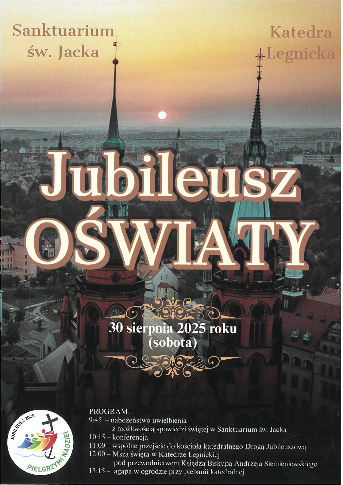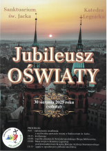 Biskup Legnicki zaprasza na Jubileusz Oświaty Diecezji Legnickiej w dniu 30 sierpnia w Legnicy. Obchody rozpoczną się o godz. 9:45 w Sanktuarium św. Jacka (w programie: konferencja, adoracja Najświętszego Sakramentu, sakrament pokuty oraz poczęstunek).