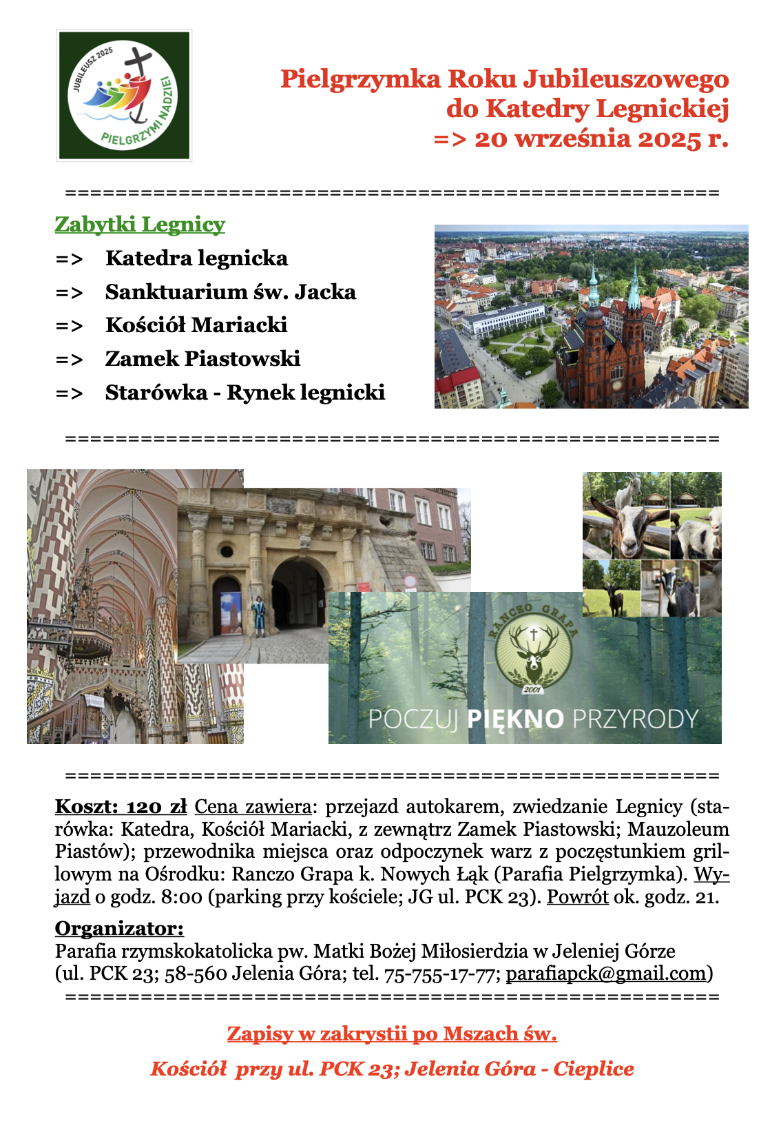 W programie: Msza św. w Katedrze (godz. 12:00), zwiedzanie z przewodnikiem zabytków legnickiej starówki, modlitwa w Sanktuarium św. Jacka - miejsce cudu eucharystycznego, a także spotkanie piknikowe w Ośrodku Grapa k. Pielgrzymki (.https://www.ranczograpa.pl/ ).