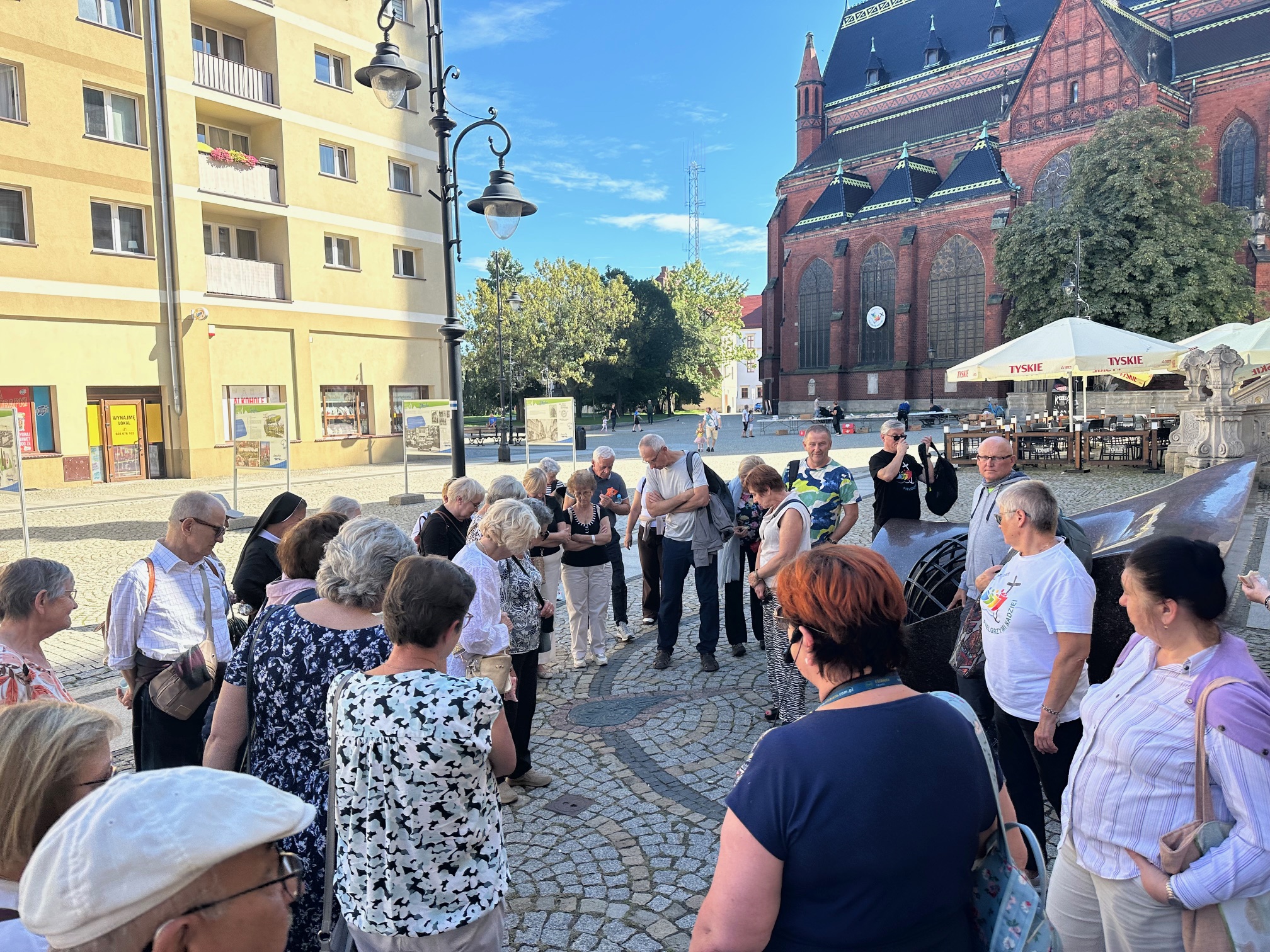 Do Legnicy dotarliśmy „zgodnie z planem” czyli o 10:00 i „wzięliśmy na pokład naszego autokaru panią Elżbietę Kot, która jest właścicielką Biura podróży, z którym nasza parafia współpracuje „nie od dziś”. Pani Elżbieta jest legniczanką, która z wielkim zaangażowaniem opowiadała o swoim mieście - chciała nam jak najdokładniej pokazać miejsca, które są tak ważne w jej życiu. Ponieważ uroczysta Eucharystia w Katedrze Legnickiej zaczynała się o godz. 12:00, mieliśmy część zwiedzania przed Mszą św., a po niej kontynuowaliśmy poznawania Starego Miasta. Zwiedzanie zaczęliśmy od Zamku Piastowskiego i w promieniach słońca dotarliśmy do Katedry. Wchodziliśmy oczywiście jak przystało na „Pielgrzymów nadziei” przez BRAMĘ JUBILEUSZOWĄ.