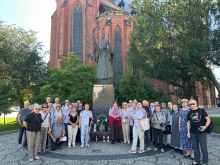 Z Katedry udaliśmy się pod pobliski pomnik Jana Pawła II. Jak nam powiedziała pani Elżbieta to są dwa najważniejsze punkty w Legnicy, które tworzą takie centrum duchowe, miejsce spotkań - m. in. tam mieliśmy okazję spotkać się z 3 siostrami ze Zgromadzenia Uczennic Pana Jezusa Chrystusa (Stany Zjednoczone), a obecnie przebywają w Legnicy.