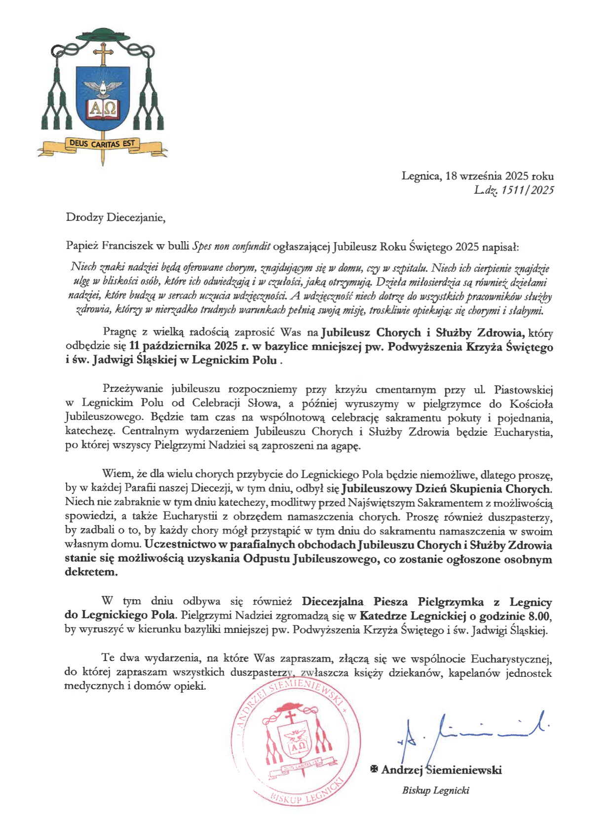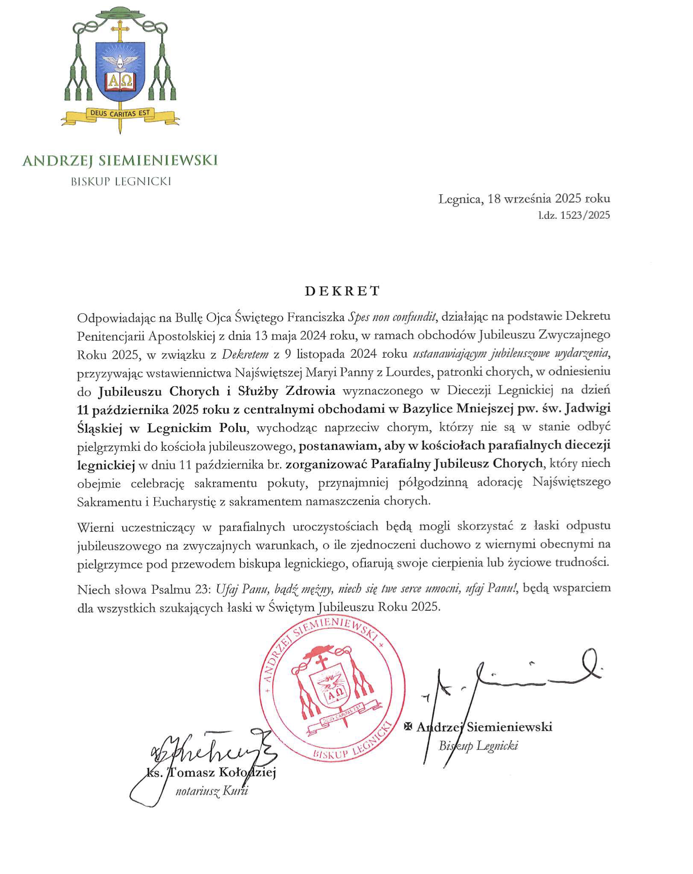W ramach głównych obchodów Roku Jubileuszowego w Diecezji Legnickiej będziemy obchodzić w sobotę 11 października 2025.