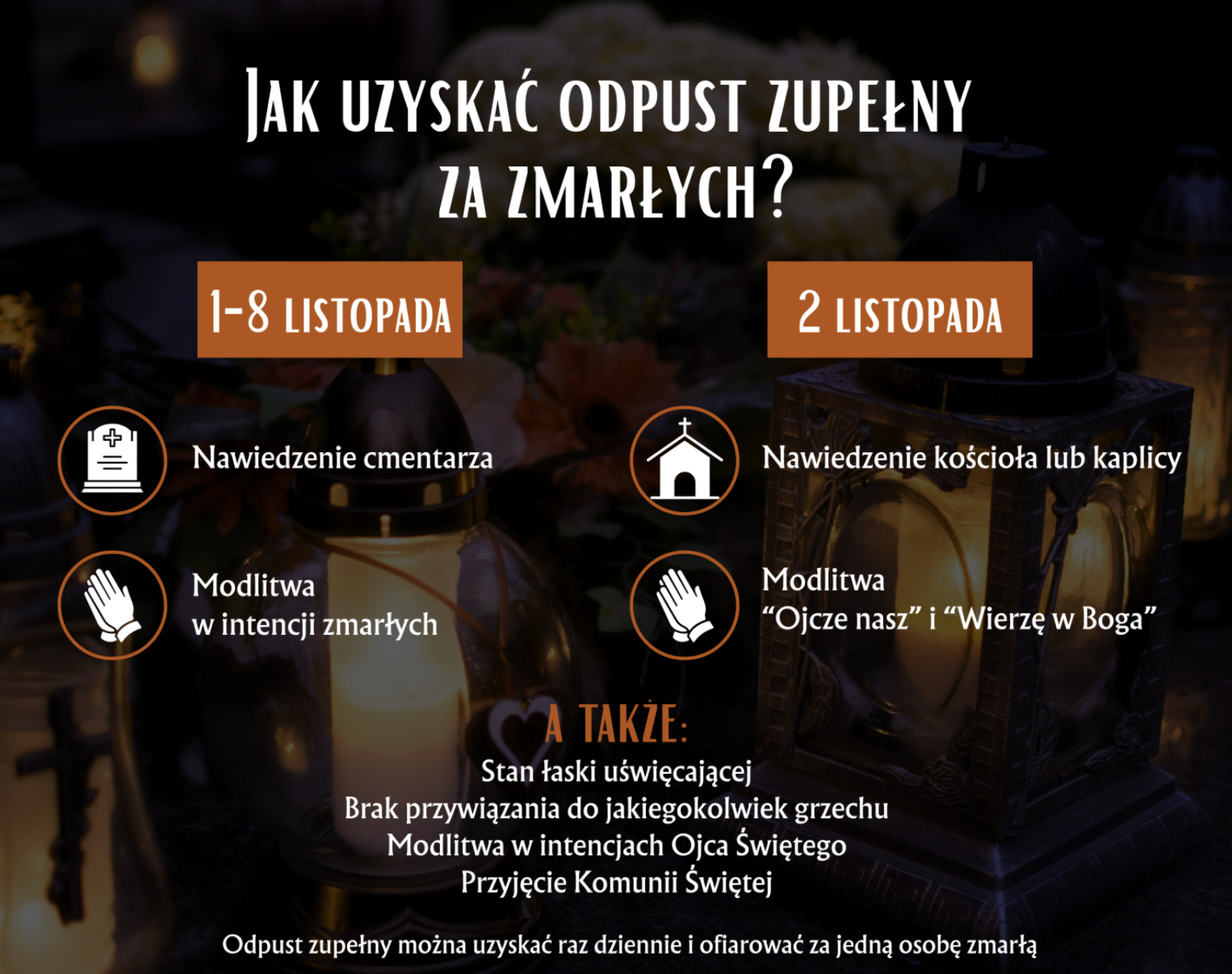 Każdy wierny, który nabożnie odwiedzi cmentarz i pomodli się za zmarłych, może uzyskać odpust za zmarłych.