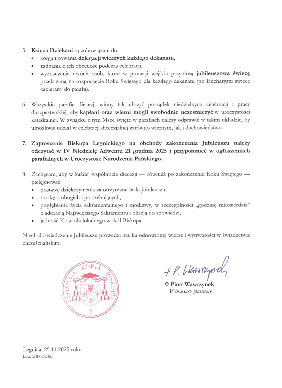 W Diecezji Legnickiej uroczyste zakończenie Roku Jubileuszowego 2025, odbędzie się w Katedrze Legnickiej, w niedzielę 28 grudnia 2025 r. o godz. 15:00.